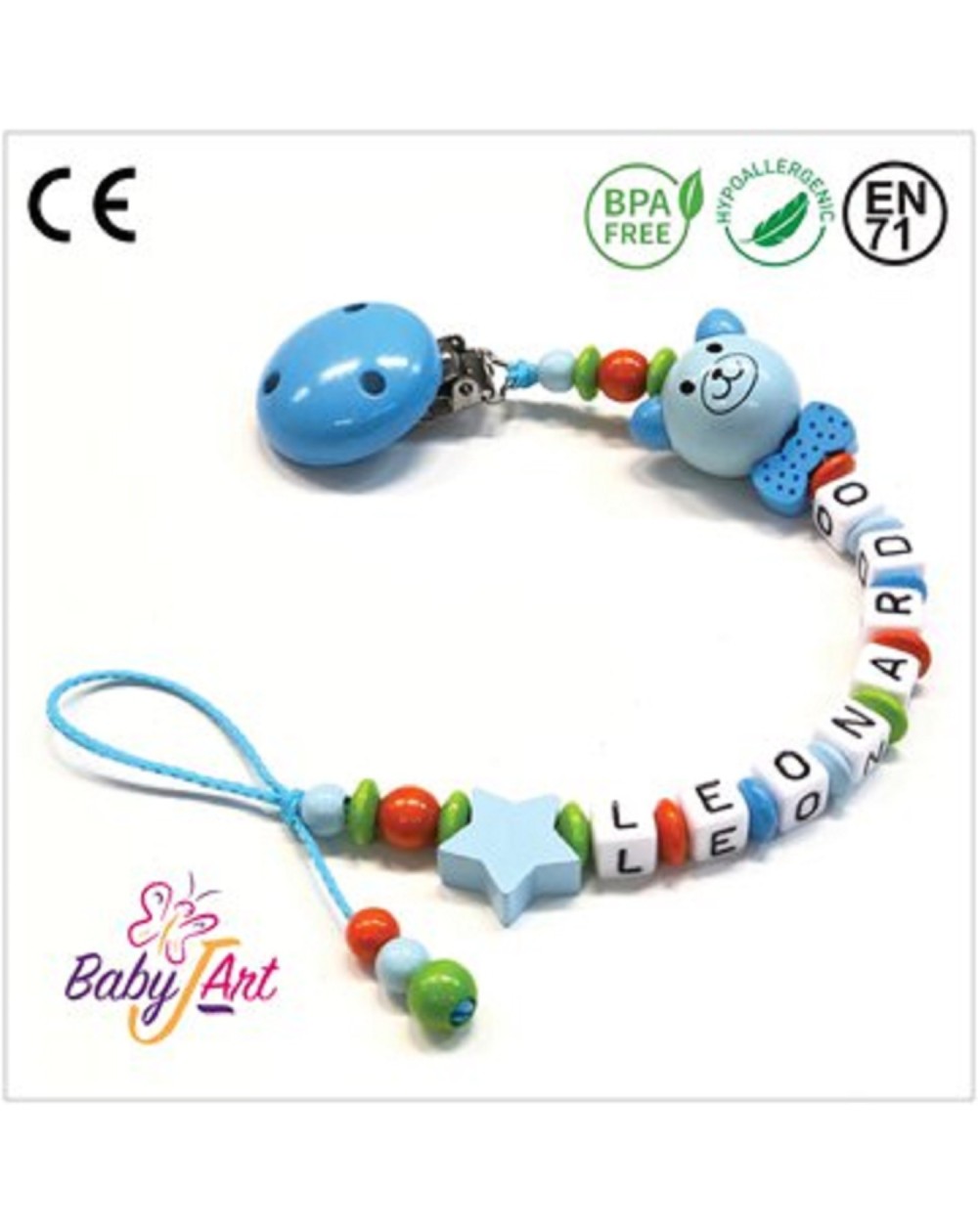 Babyjart Schnullerkette aus Holz mit Namen, Schnullerhaken / Adapter mam