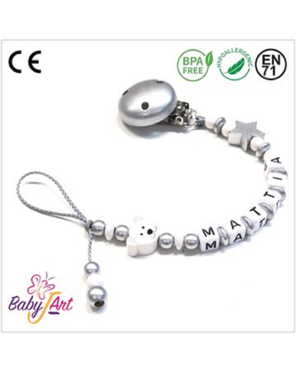 Babyjart Schnullerkette aus Holz mit Namen, Schnullerhaken / Adapter mam