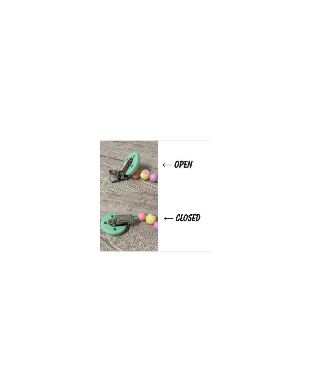 Silikonschnullerkette, streng nach EN 71-3 von Hand gefertigt. Individualisierbar mit Namen. Name maximal 10 Buchstaben; Doppelname max. 9 Buchstaben. Wahl der Varianten CLIP und FIGURE