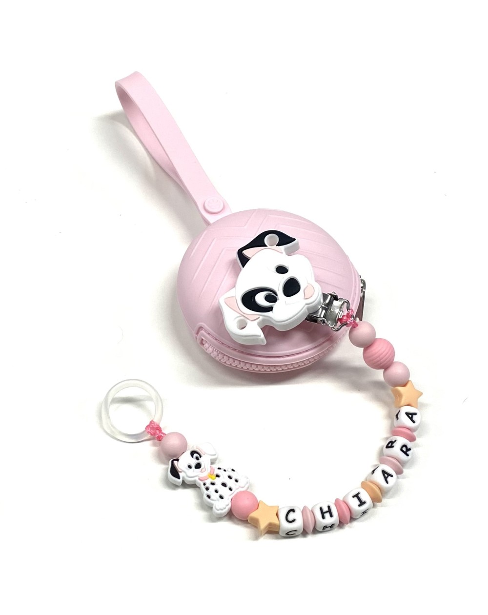 Babyjart Silikonschnullerkette PRESTIGE DALMATINER mit Name, Haken/Adapter Schnuller MAM und CHICCO