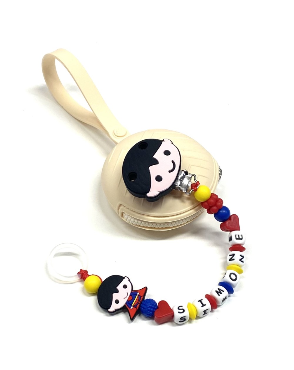 Babyjart silicone dummy chain PRESTIGE SUPERMAN with name, hook/adapter pacifier MAM and CHICCO