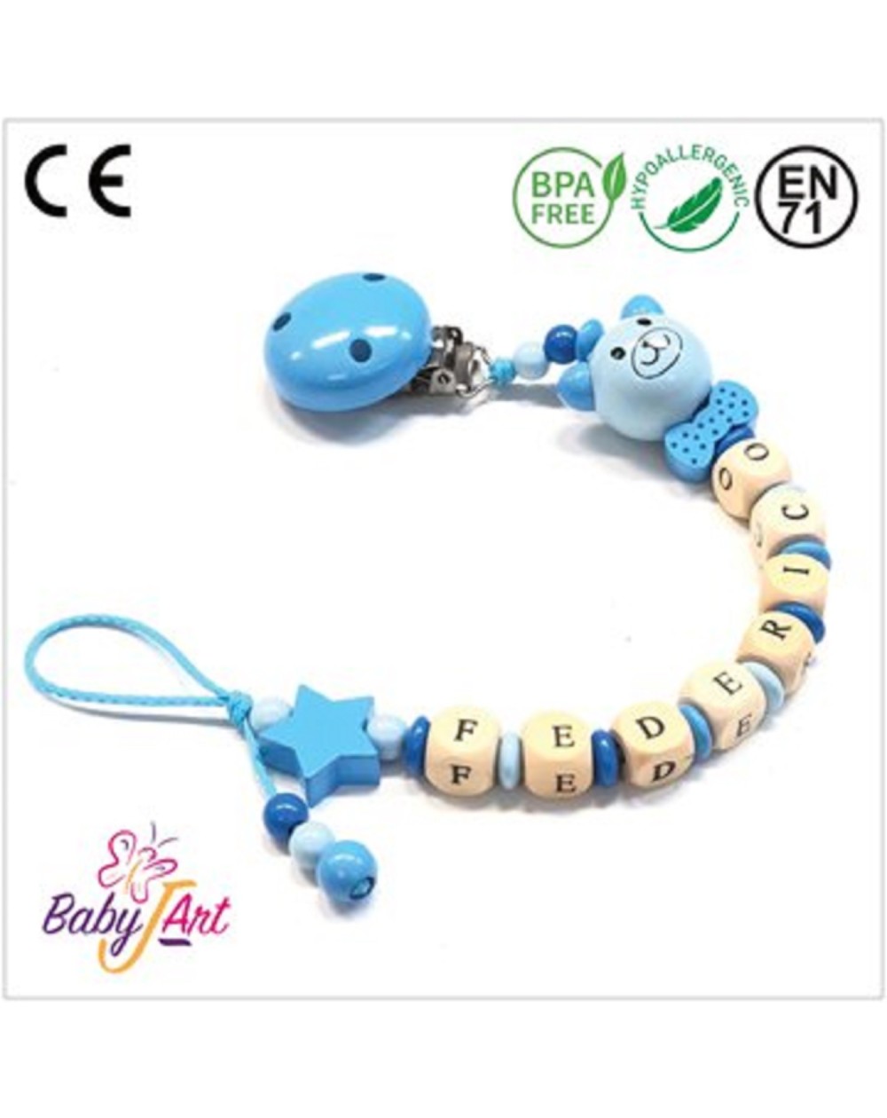 Babyjart wooden dummy chain with name, hook / adapter pacifier mam