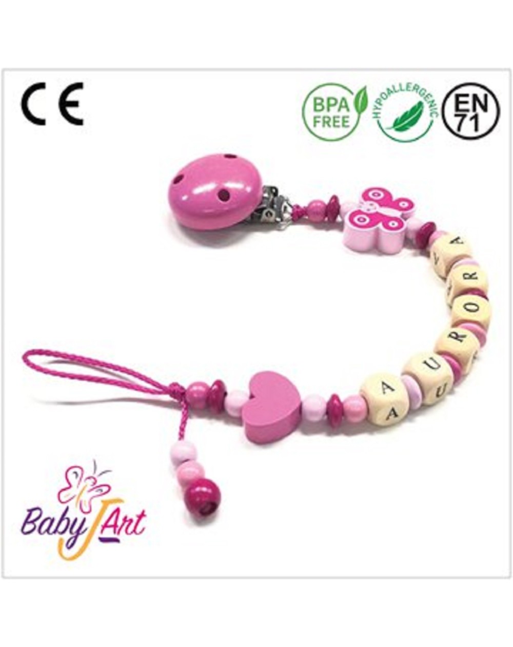 Babyjart wooden dummy chain with name, hook / adapter pacifier mam