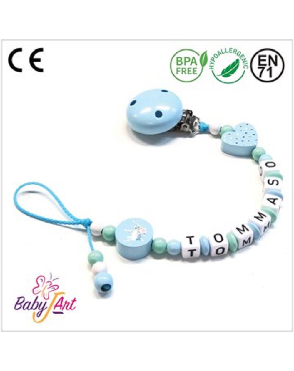 Babyjart wooden dummy chain with name, hook / adapter pacifier mam