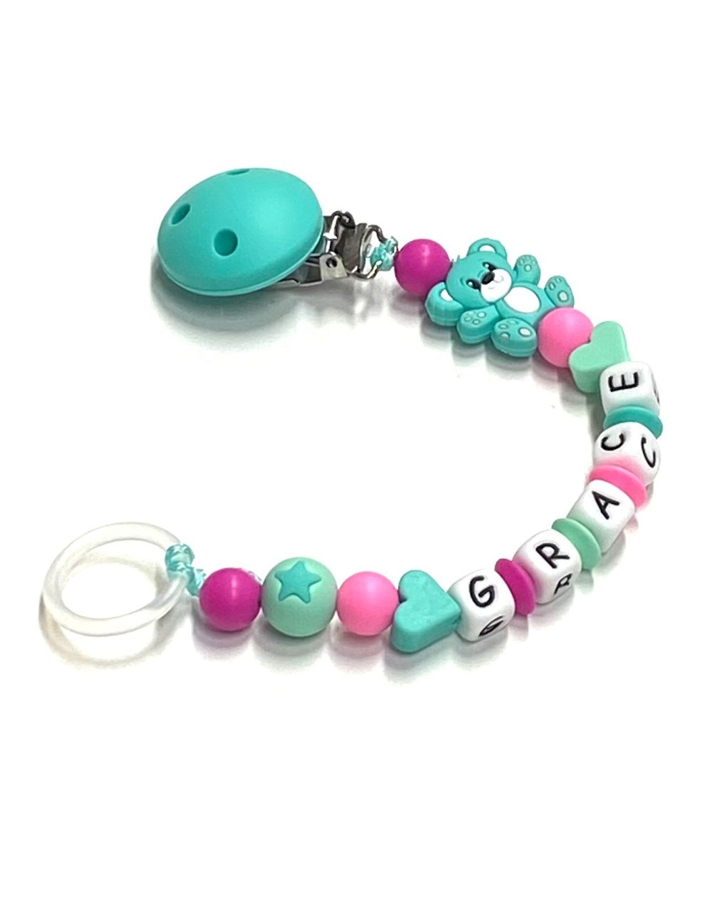 Silicone chain holder, made strictly by hand in compliance with EN 71-3. Customizable with name. Name max 10 letters; Double name max 9 letters. Choice of the CLIP and FIGURE variants