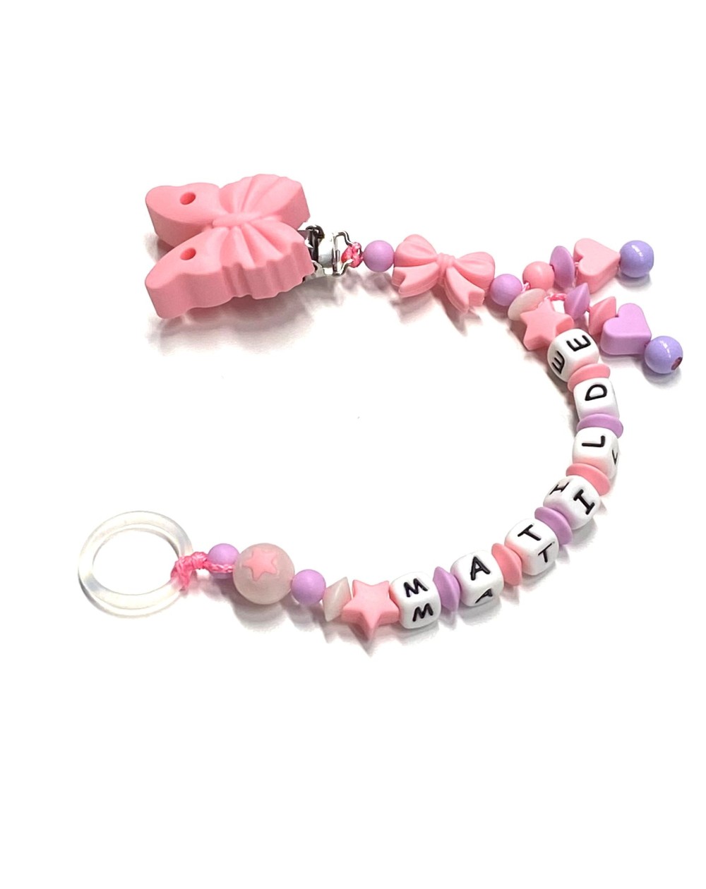 Silicone chain holder, made strictly by hand in compliance with EN 71-3. Customizable with name. Name max 10 letters; Double name max 9 letters. Choice of the CLIP and FIGURE variants