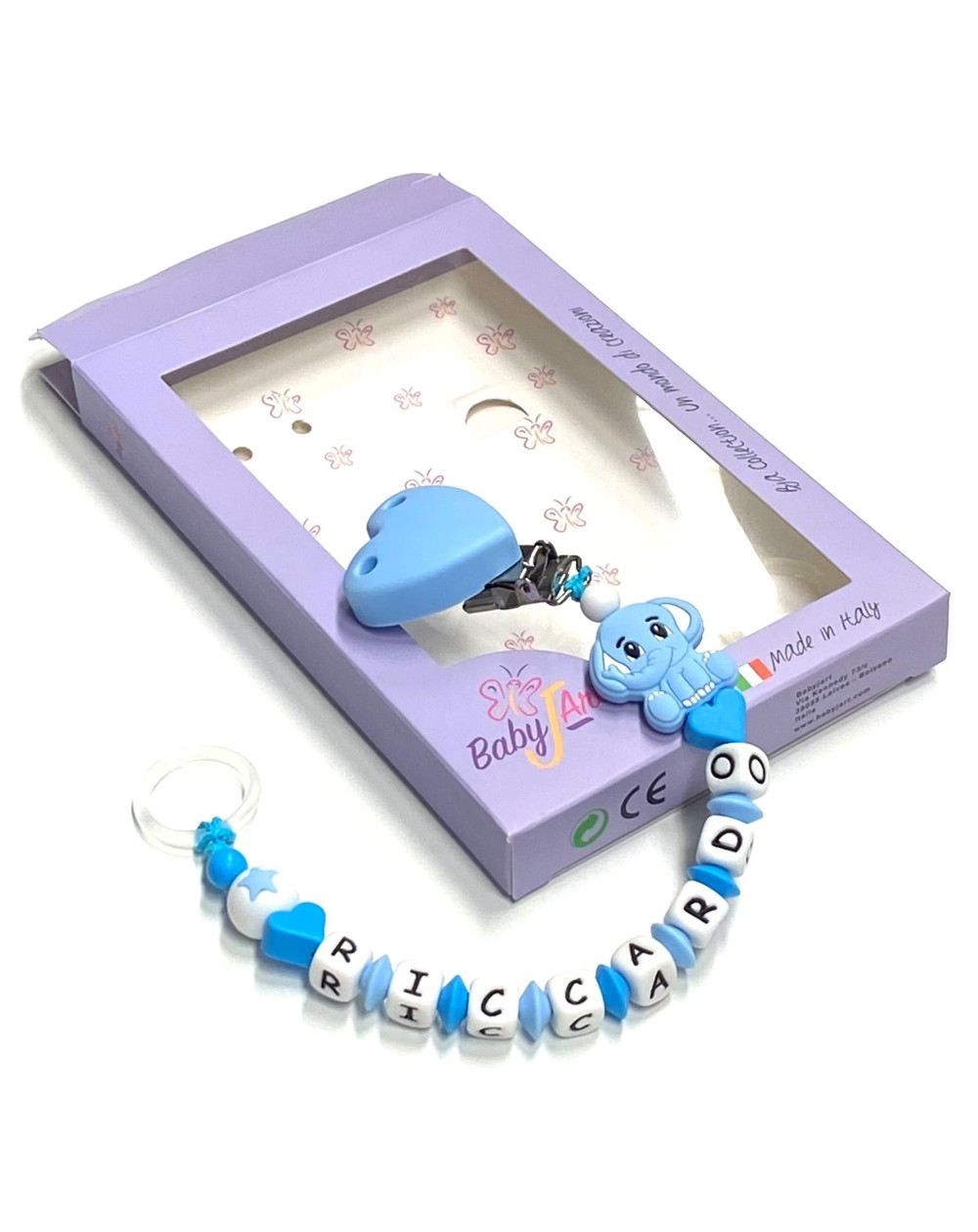 Silicone chain holder, made strictly by hand in compliance with EN 71-3. Customizable with name. Name max 10 letters; Double name max 9 letters. Choice of the CLIP and FIGURE variants