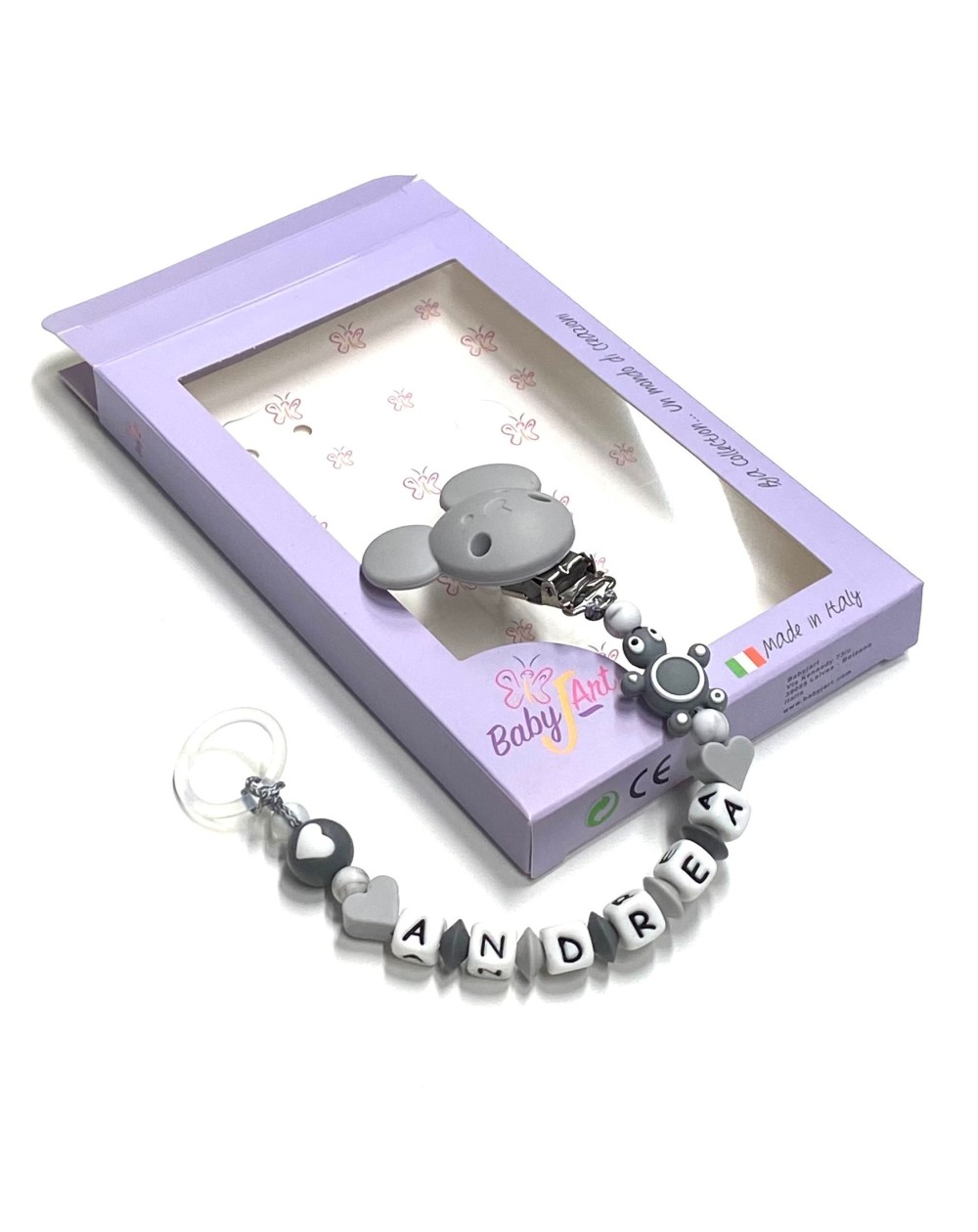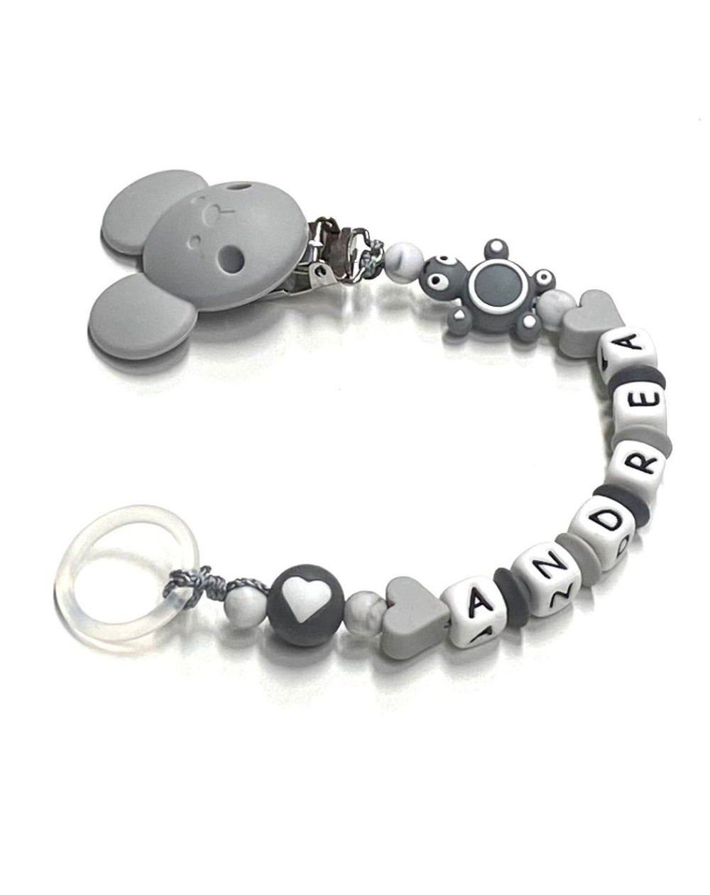 Silicone chain holder, made strictly by hand in compliance with EN 71-3. Customizable with name. Name max 10 letters; Double name max 9 letters. Choice of the CLIP and FIGURE variants