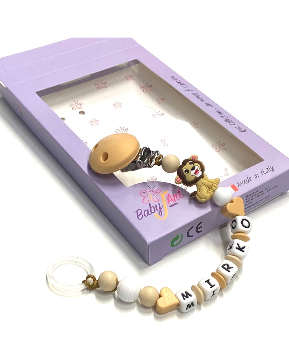 Silicone chain holder, made strictly by hand in compliance with EN 71-3. Customizable with name. Name max 10 letters; Double name max 9 letters. Choice of the CLIP and FIGURE variants