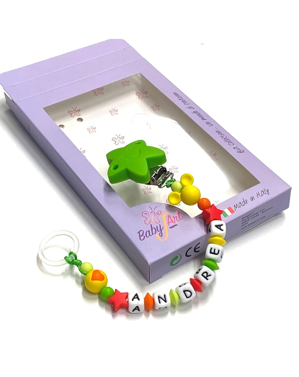 Silicone chain holder, made strictly by hand in compliance with EN 71-3. Customizable with name. Name max 10 letters; Double name max 9 letters. Choice of the CLIP and FIGURE variants
