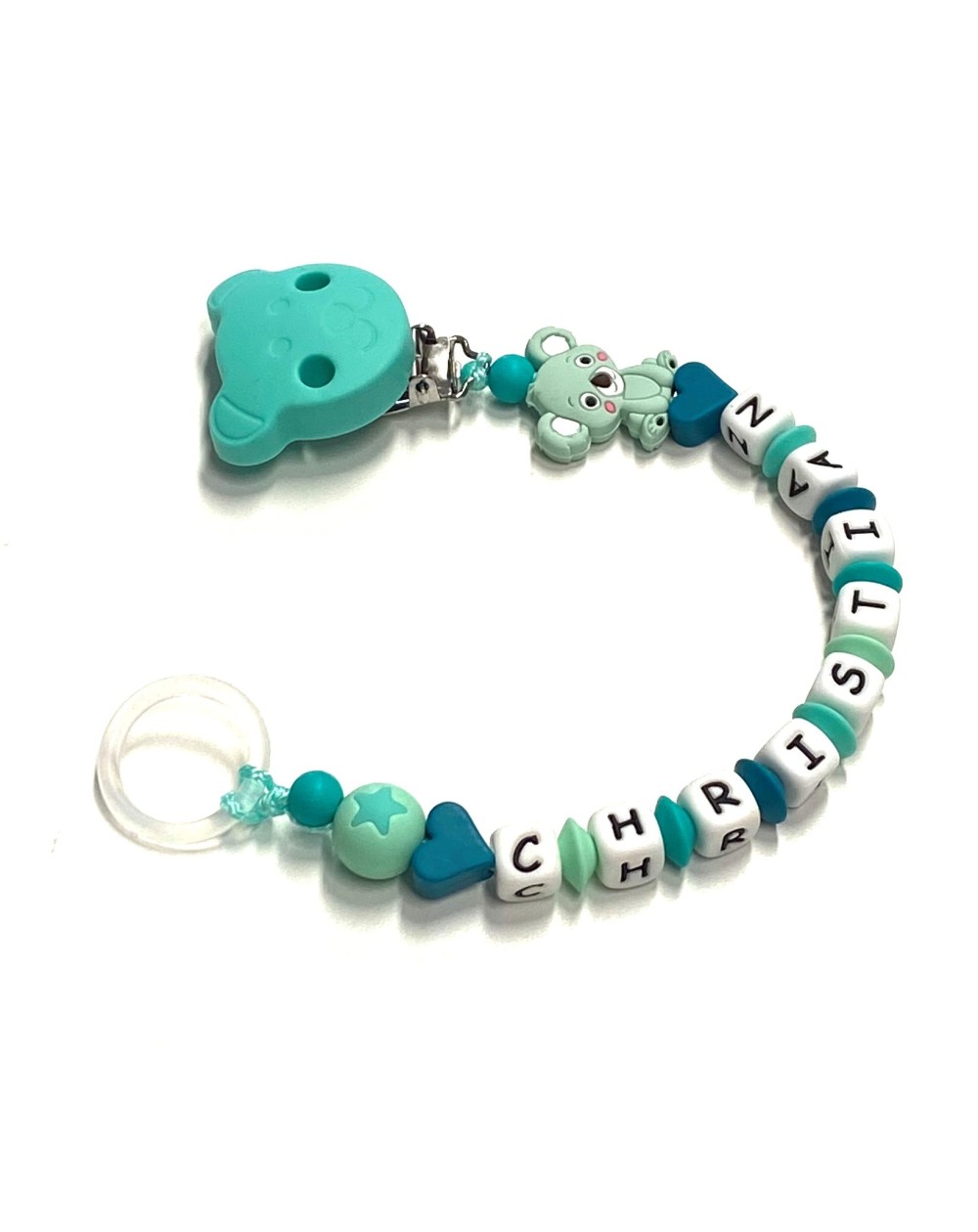Cadena de silicona para chupete, fabricada estrictamente a mano de acuerdo con EN 71-3.