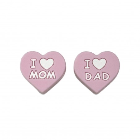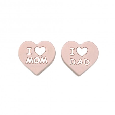 CORAZÓN I LOVE MOM/DAD en silicona. Diámetro aprox. 25mmx25mm - Agujero aprox. 3 mm verticales (de arriba a abajo).