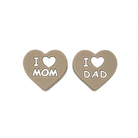 CŒUR I LOVE MOM/DAD en silicone. Diamètre env. 25mmx25mm - Trou env. 3 mm verticale (de haut en bas).