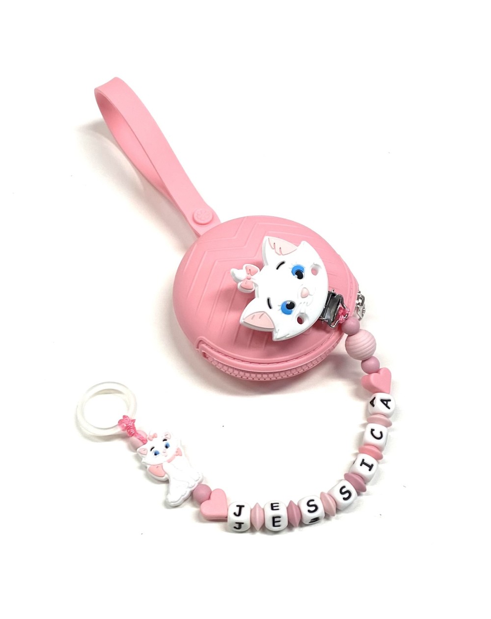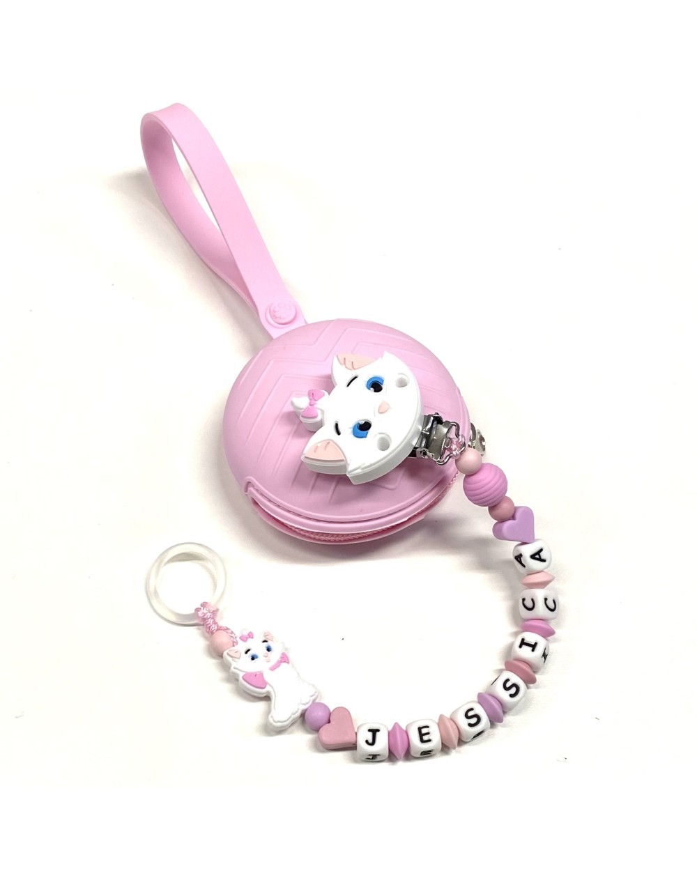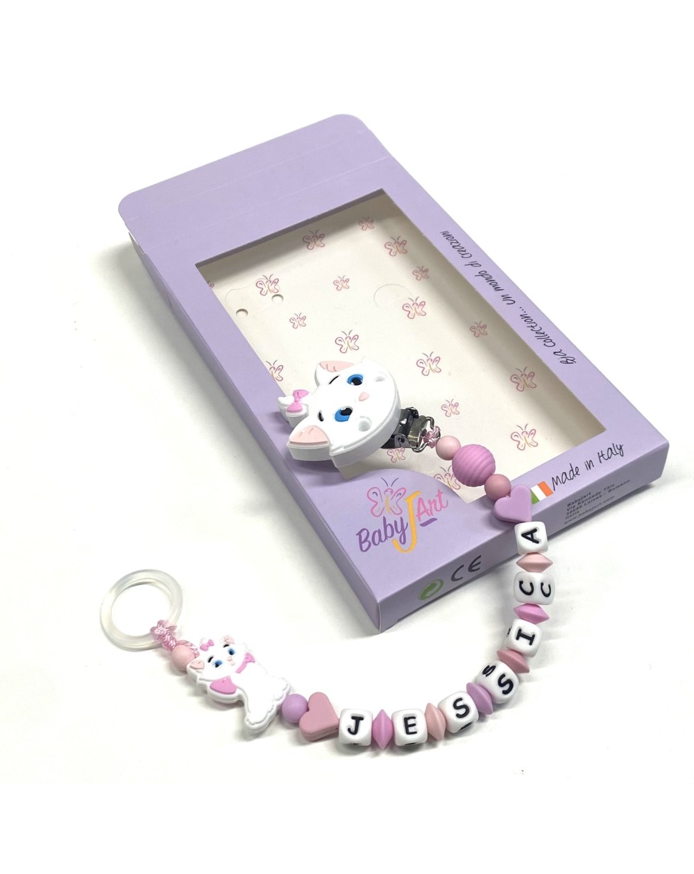 Babyjart Chaîne de tétine PRESTIGE MINOU en silicone avec nom, crochet / adaptateur de tétine MAM et CHICCO