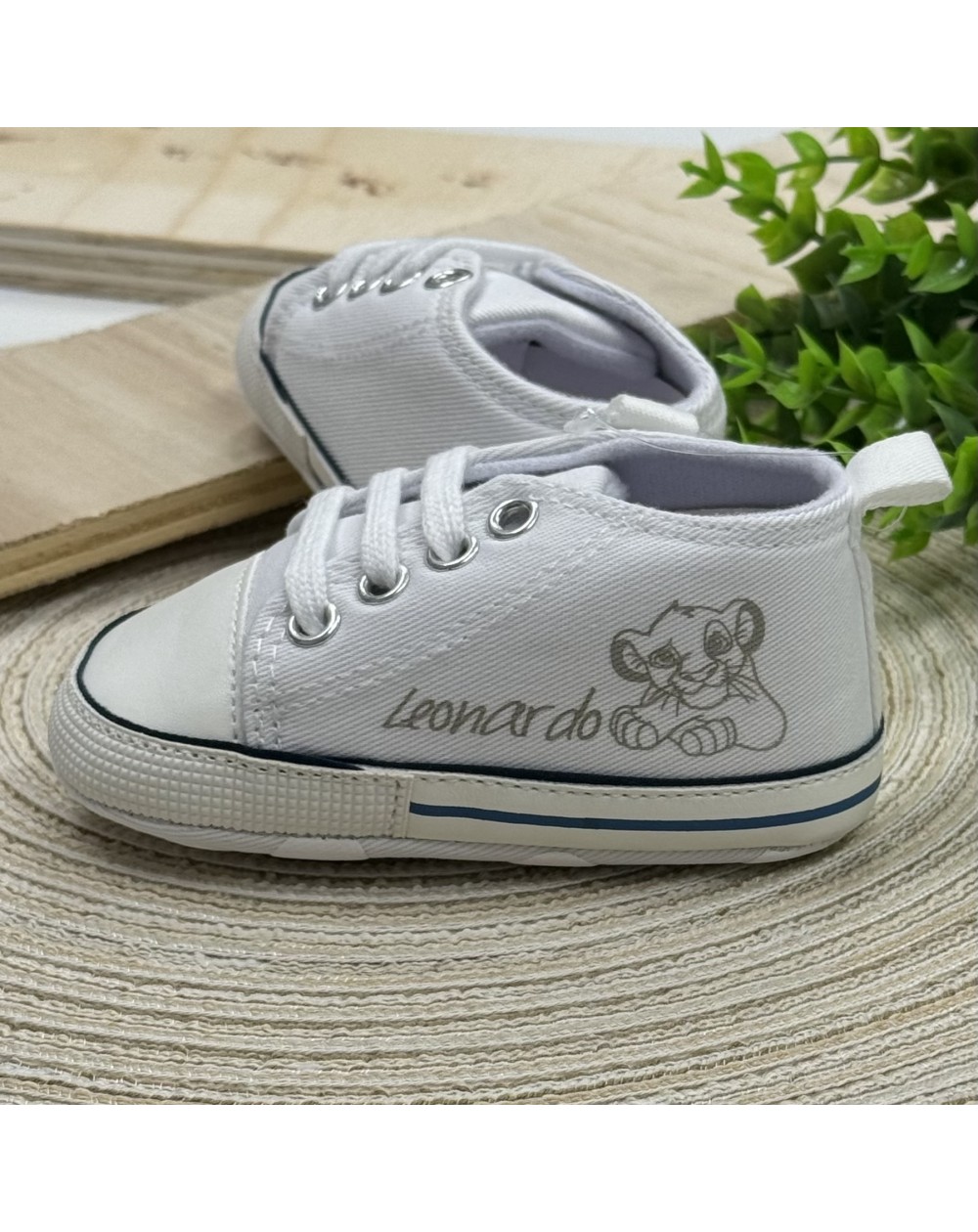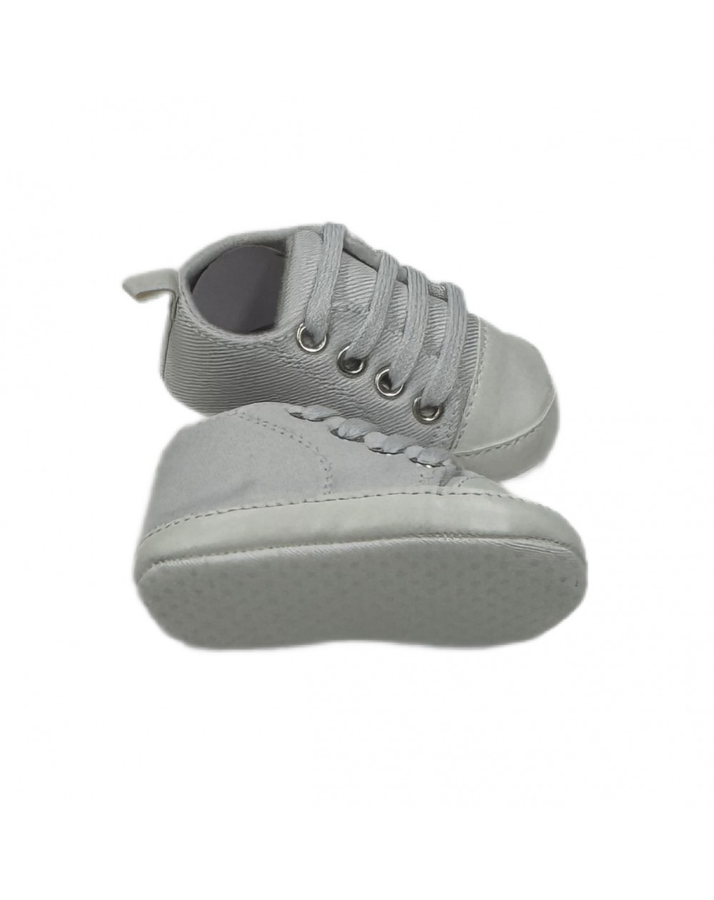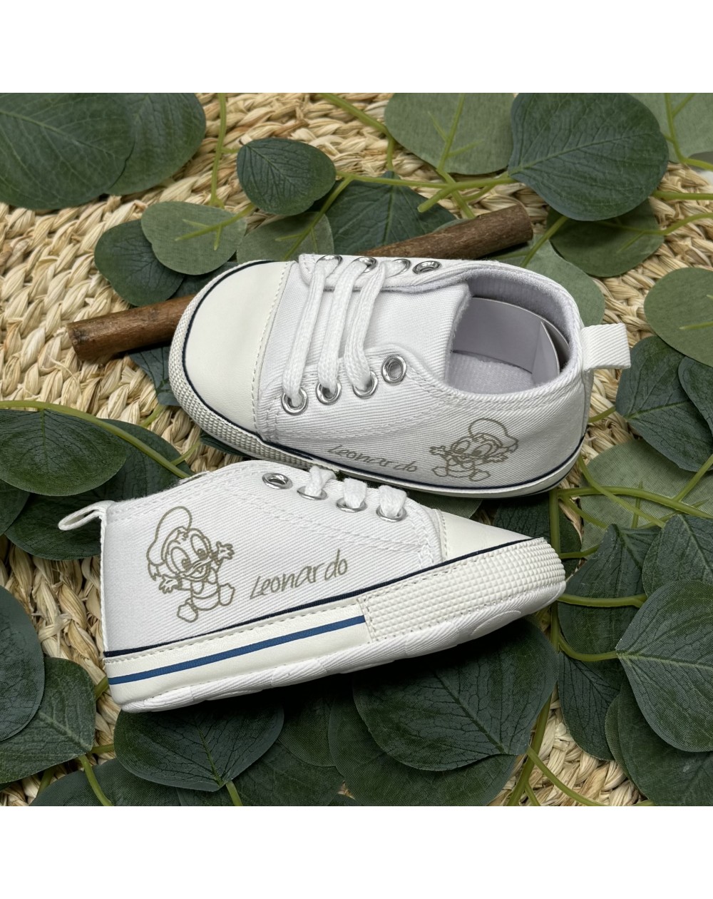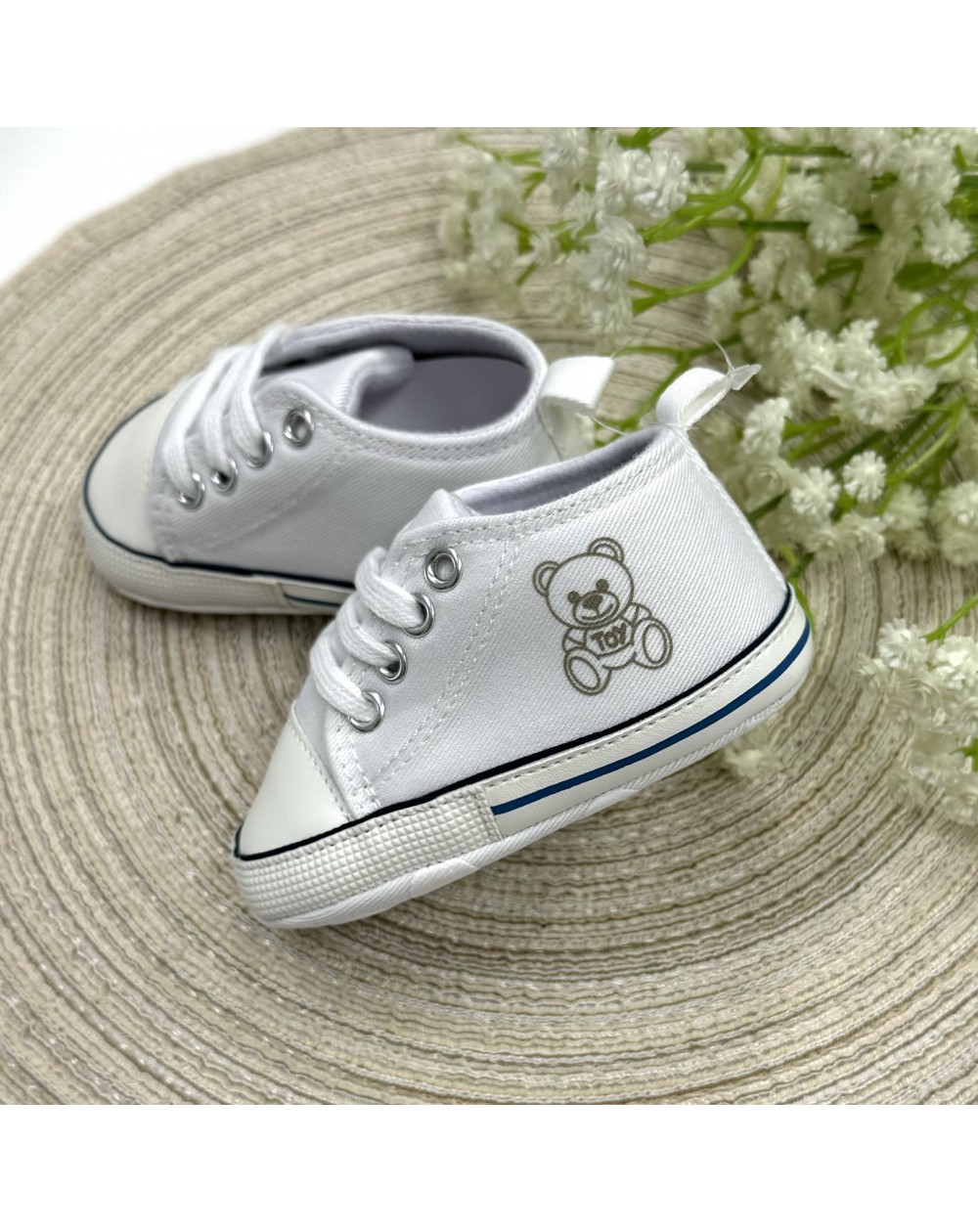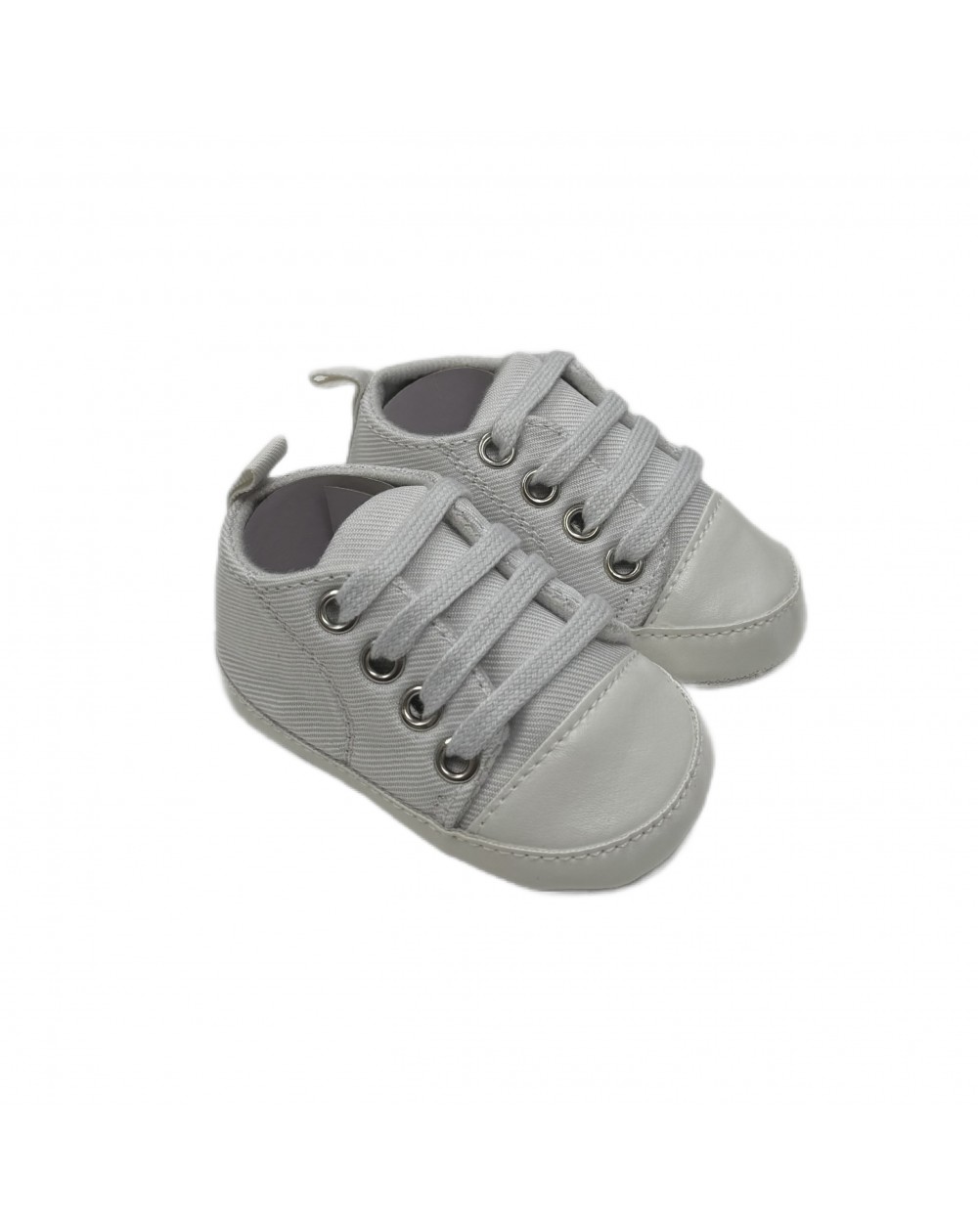 Le prime bellissime sneakers per i neonati sono realizzate in tela, con lacci, punta in ecopelle e suola in tessuto.