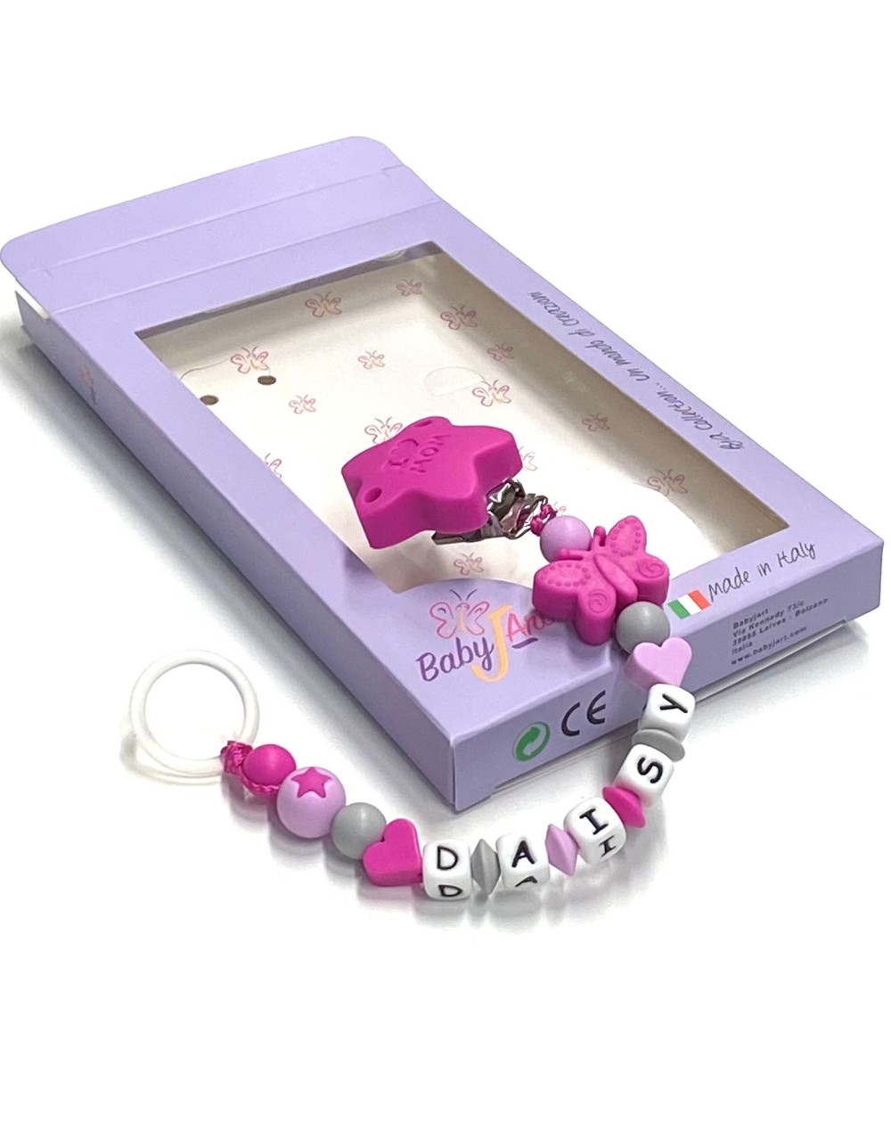 Babyjart Catenella portaciuccio silicone con nome, gancio/adattatore ciuccio MAM e CHICCO