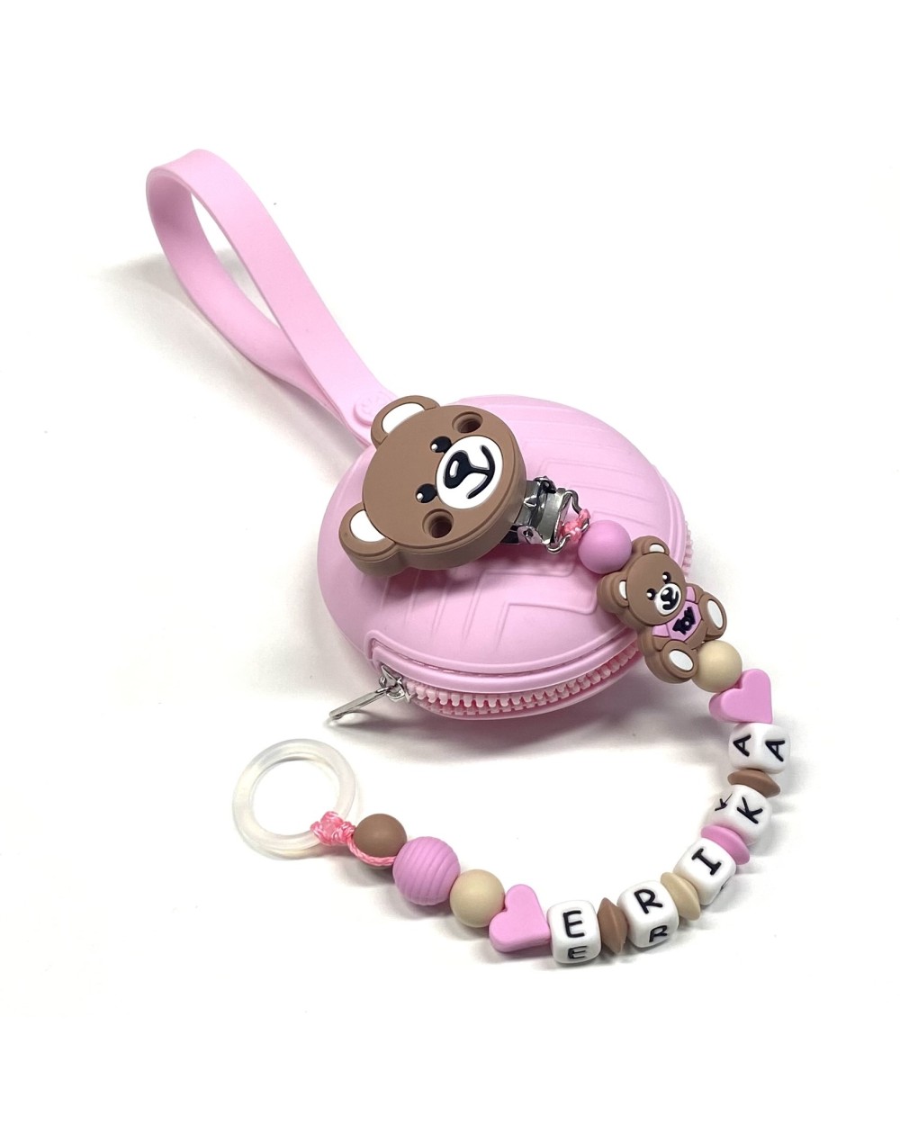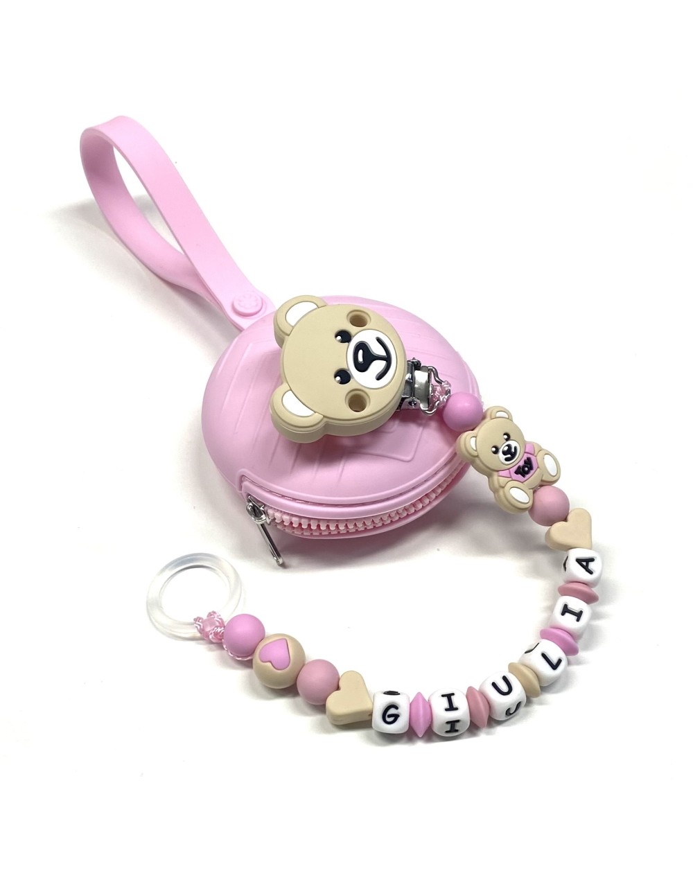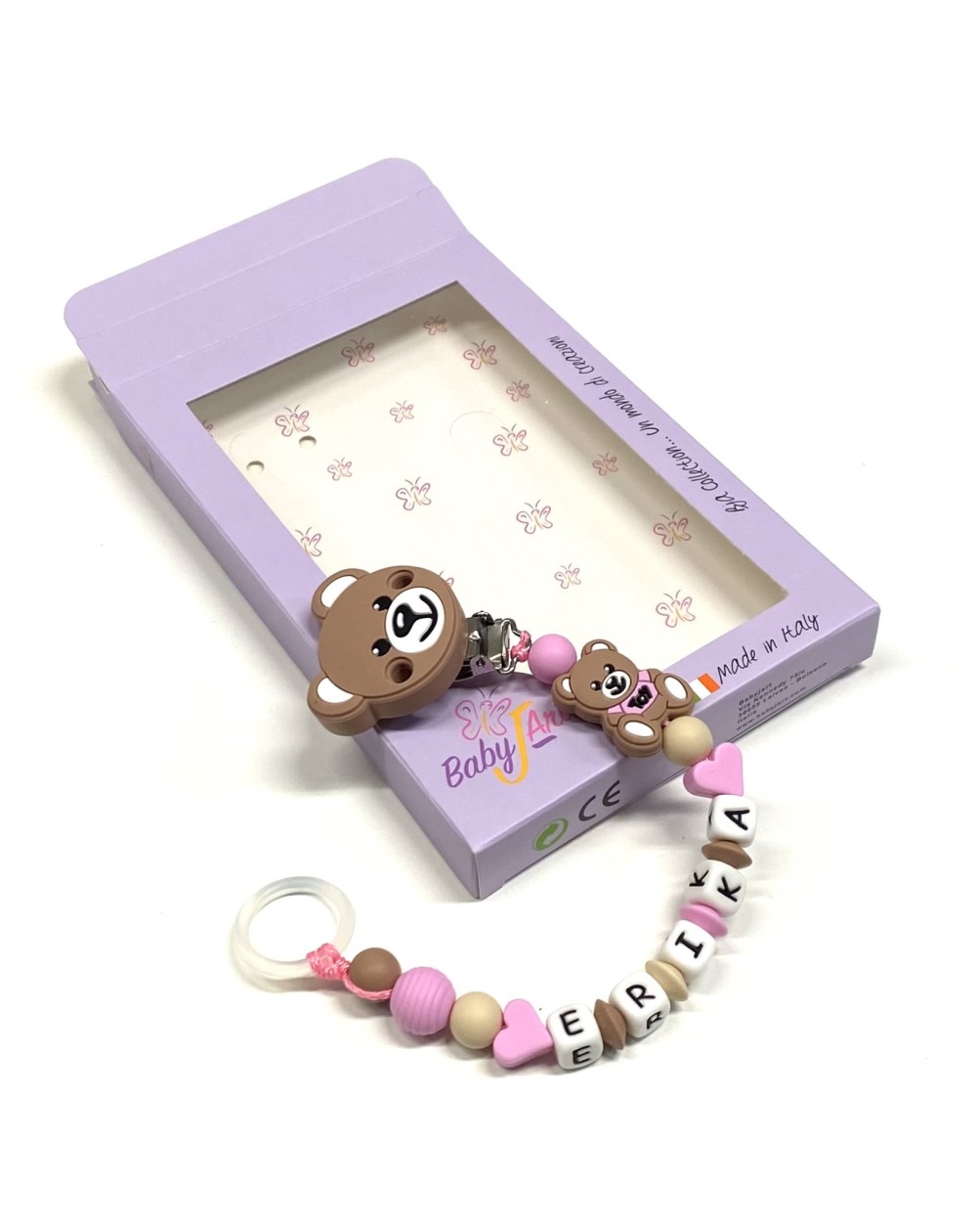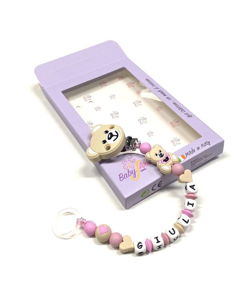 Babyjart Catenella portaciuccio PRESTIGE MOSCHINO in silicone con nome, gancio/adattatore ciuccio MAM e CHICCO