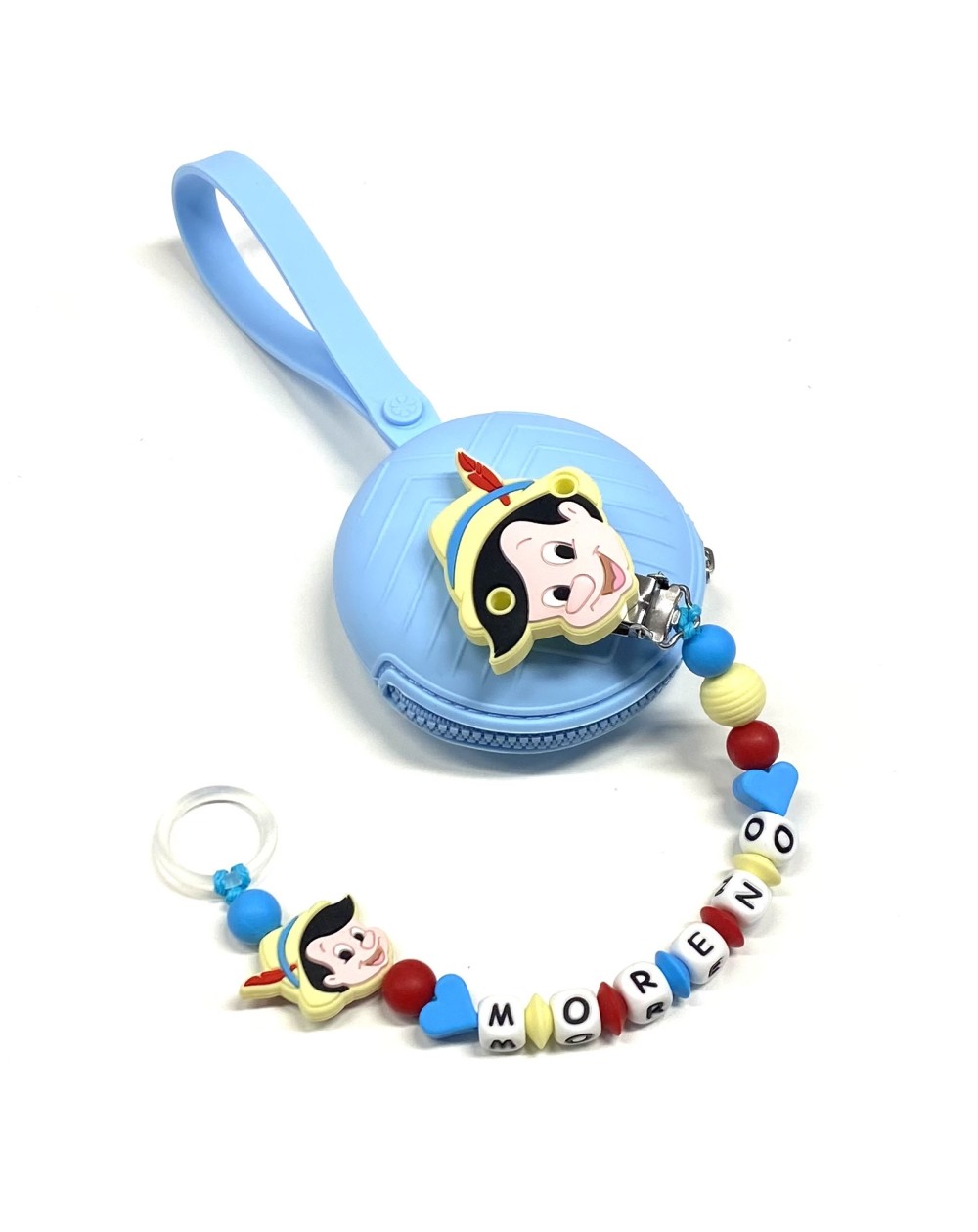 Babyjart Catenella portaciuccio PRESTIGE PINOCCHIO in silicone con nome, gancio/adattatore ciuccio MAM e CHICCO