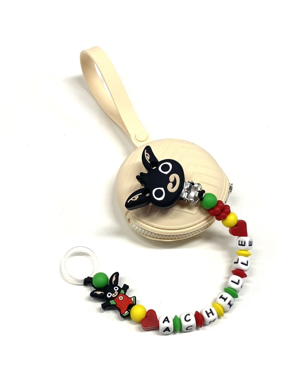Babyjart Catenella portaciuccio PRESTIGE BING in silicone con nome, gancio/adattatore ciuccio MAM e CHICCO