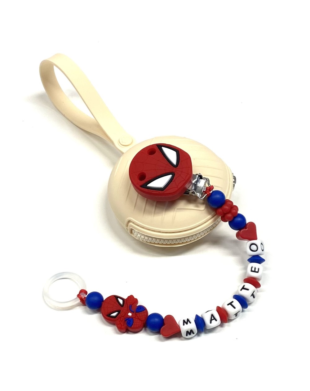 Babyjart Catenella portaciuccio PRESTIGE SPIDERMAN in silicone con nome, gancio/adattatore ciuccio MAM e CHICCO