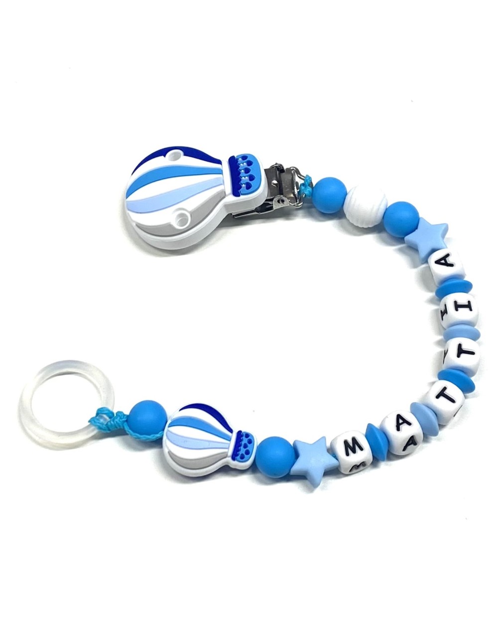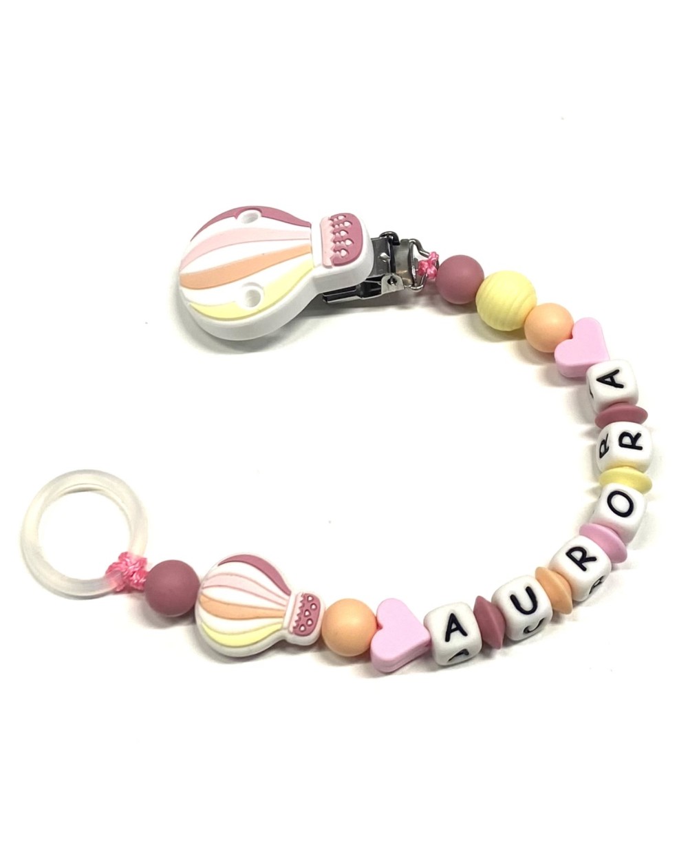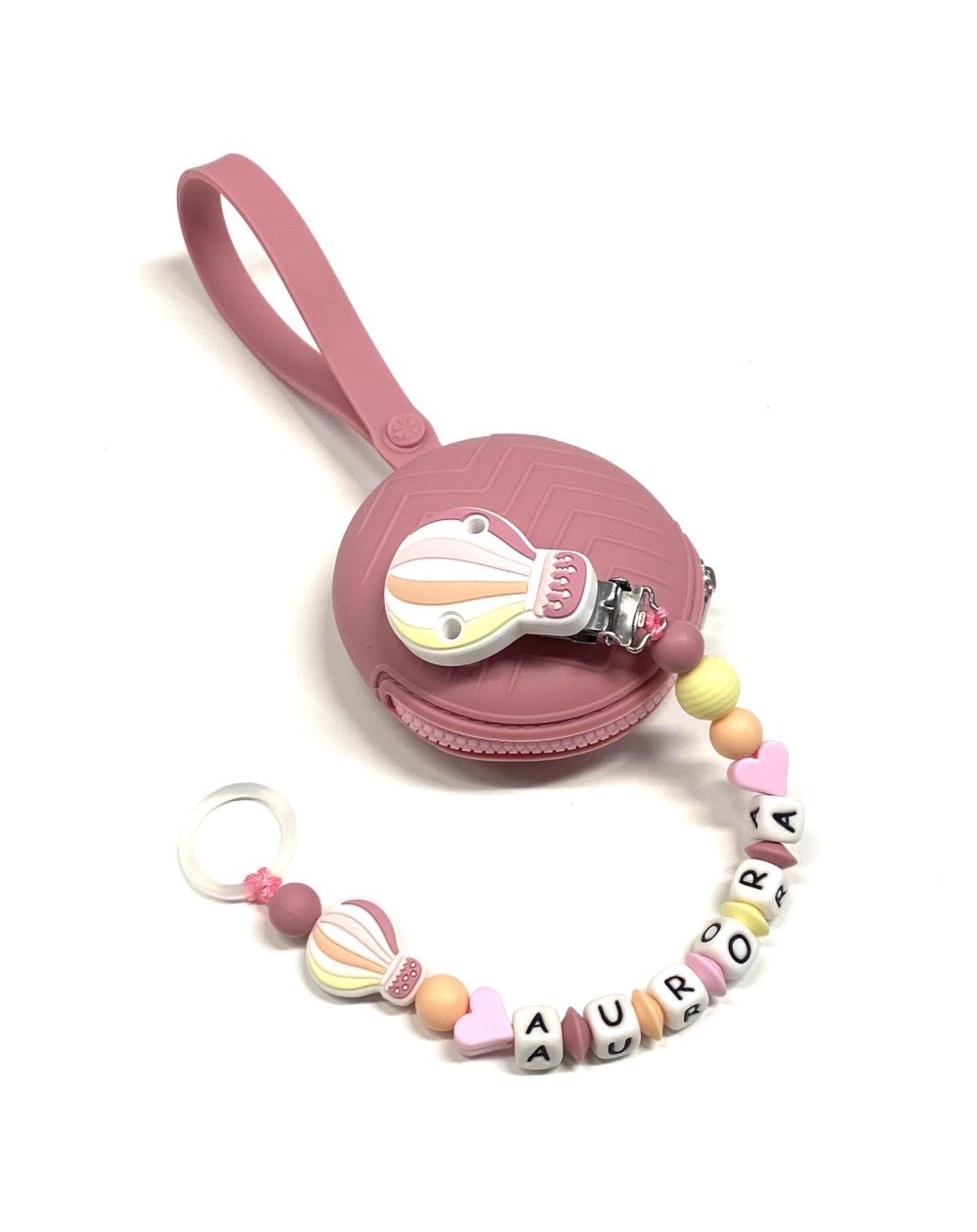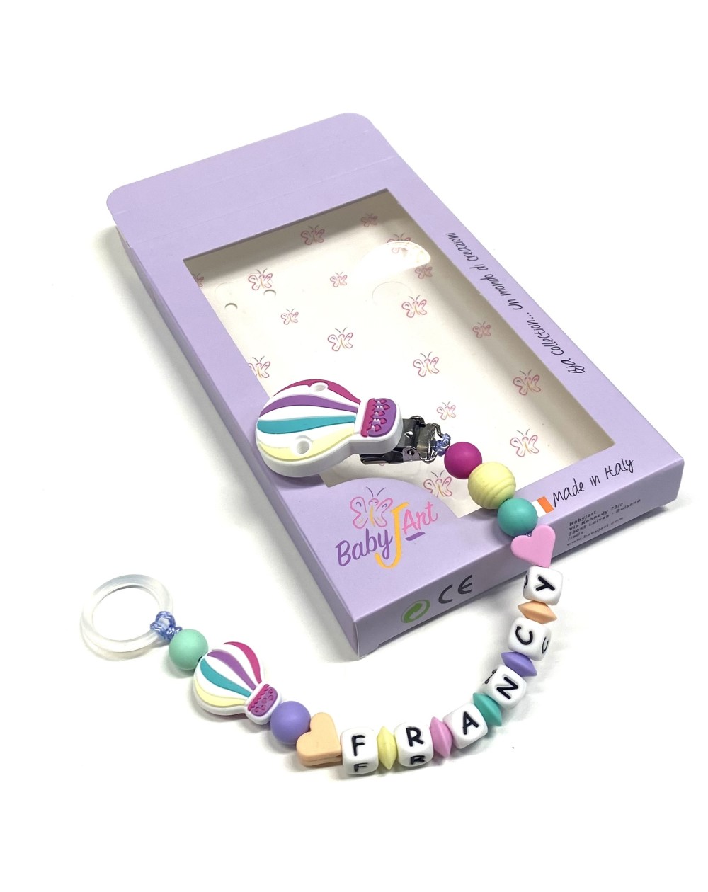 Babyjart Catenella portaciuccio PRESTIGE MONGOLFIERA in silicone con nome, gancio/adattatore ciuccio MAM e CHICCO