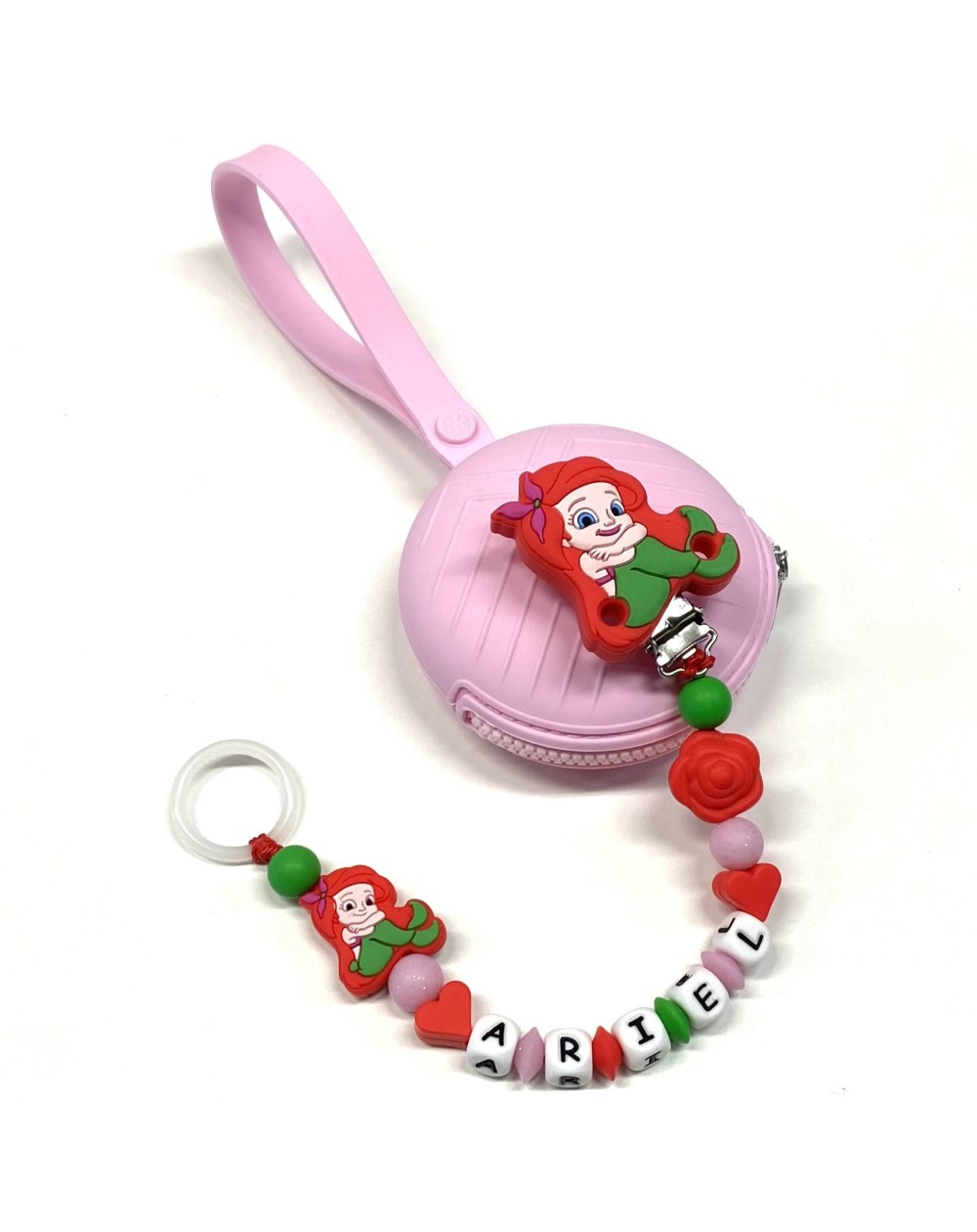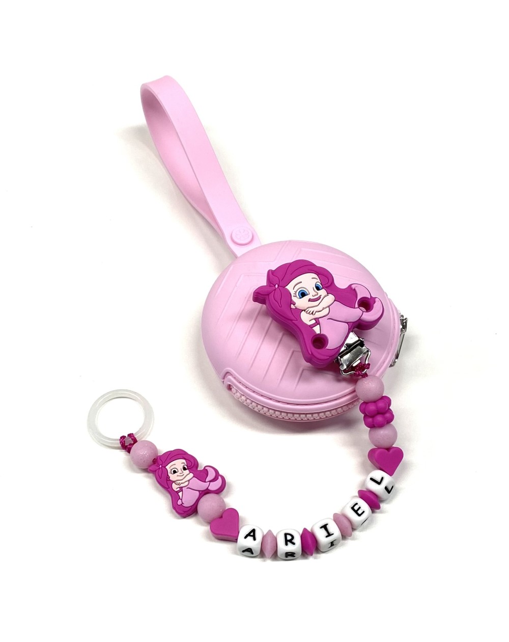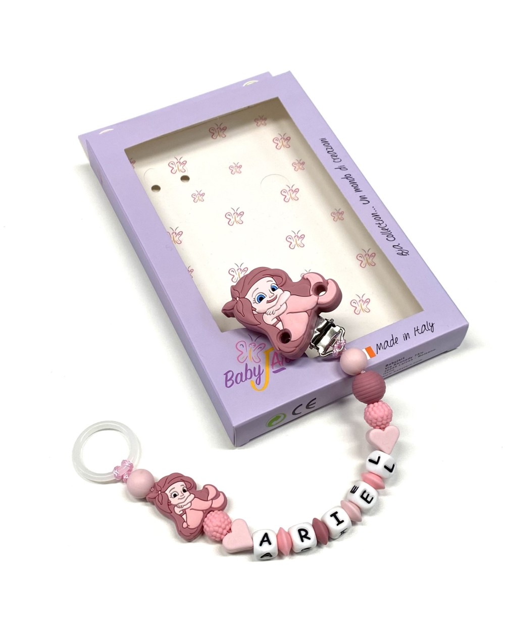 Babyjart Catenella portaciuccio PRESTIGE ARIEL LA SIRENETTA in silicone con nome, gancio/adattatore ciuccio MAM e CHICCO