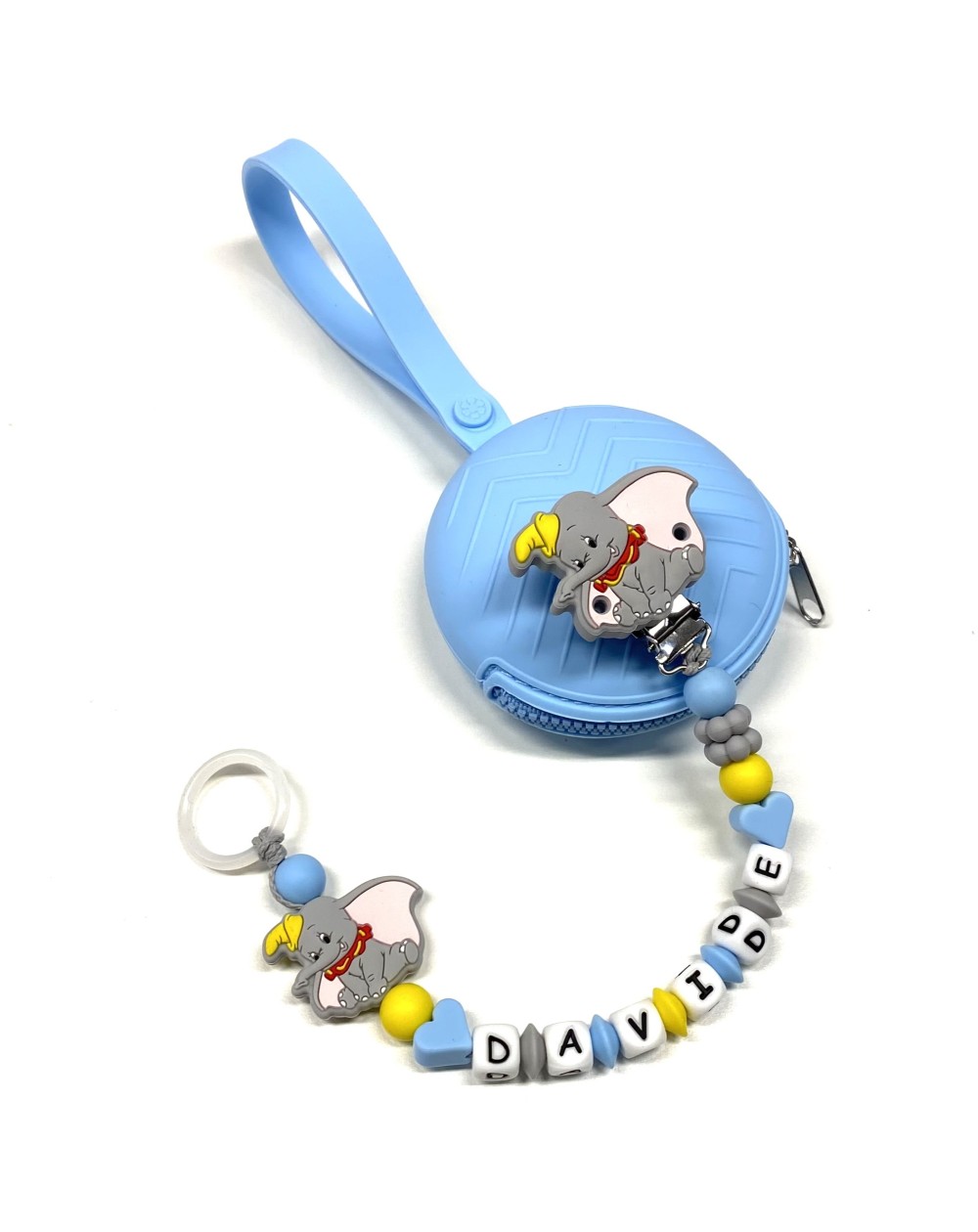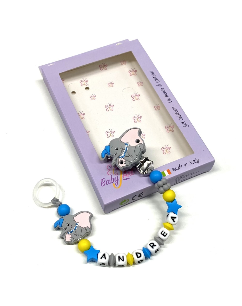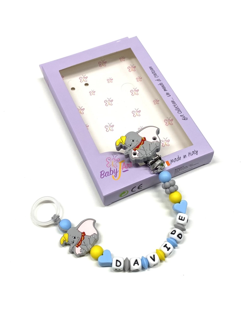 Babyjart Catenella portaciuccio PRESTIGE DUMBO in silicone con nome, gancio/adattatore ciuccio MAM e CHICCO