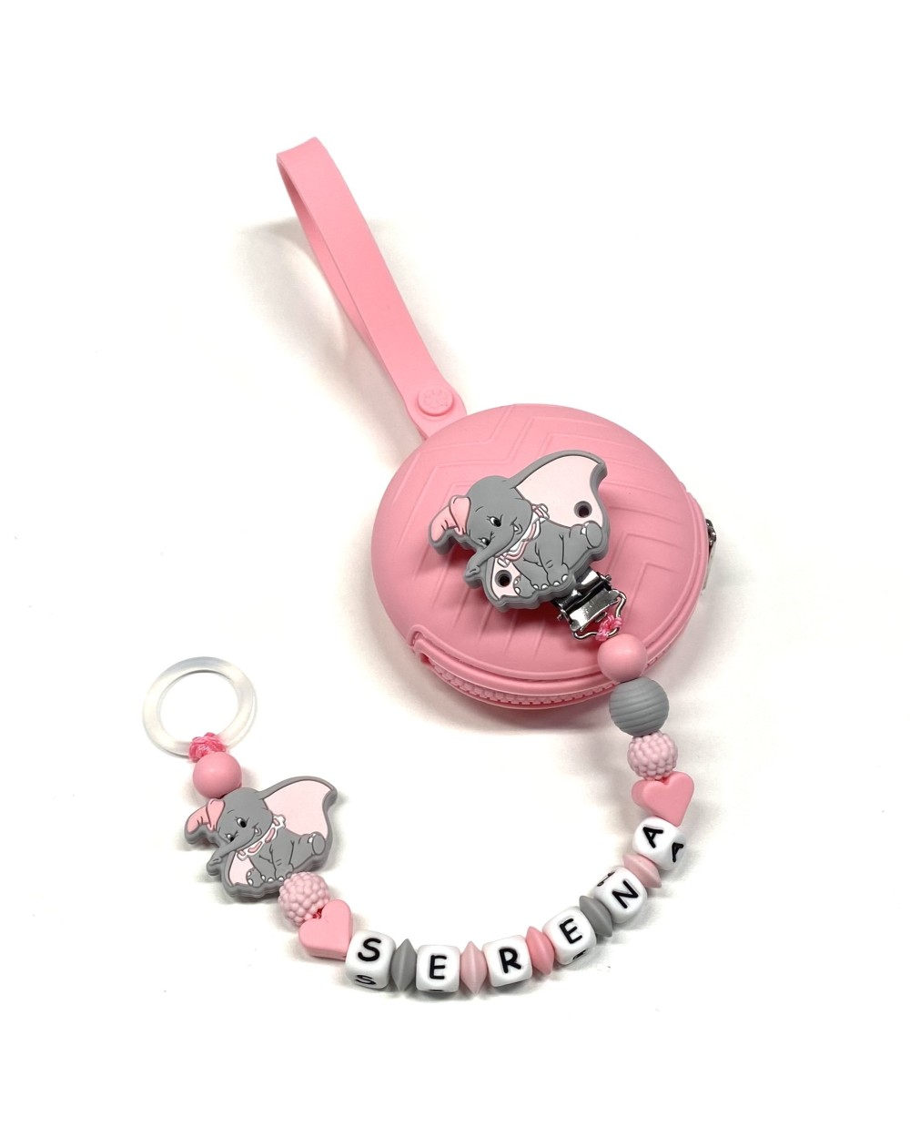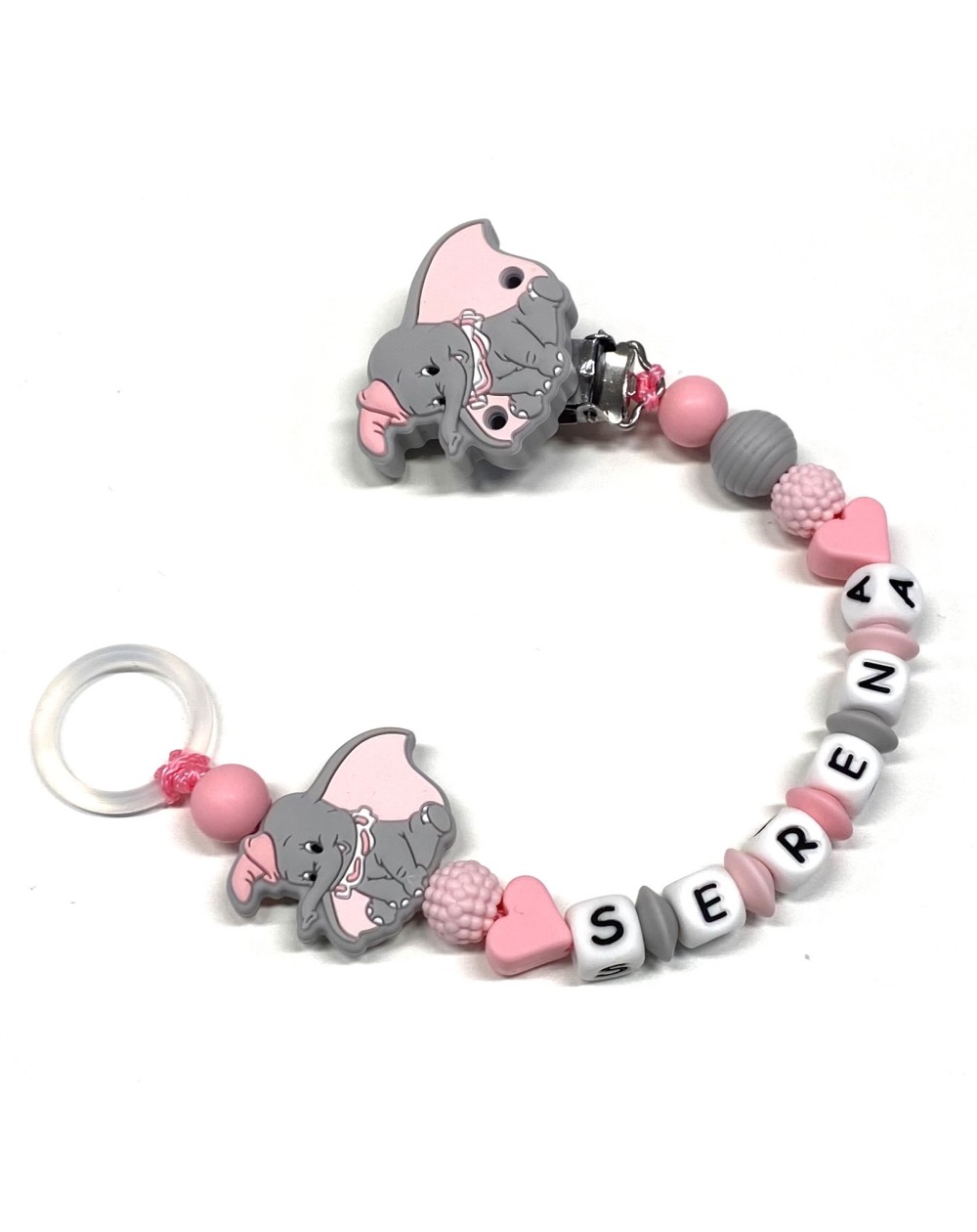 Babyjart Catenella portaciuccio PRESTIGE DUMBO in silicone con nome, gancio/adattatore ciuccio MAM e CHICCO