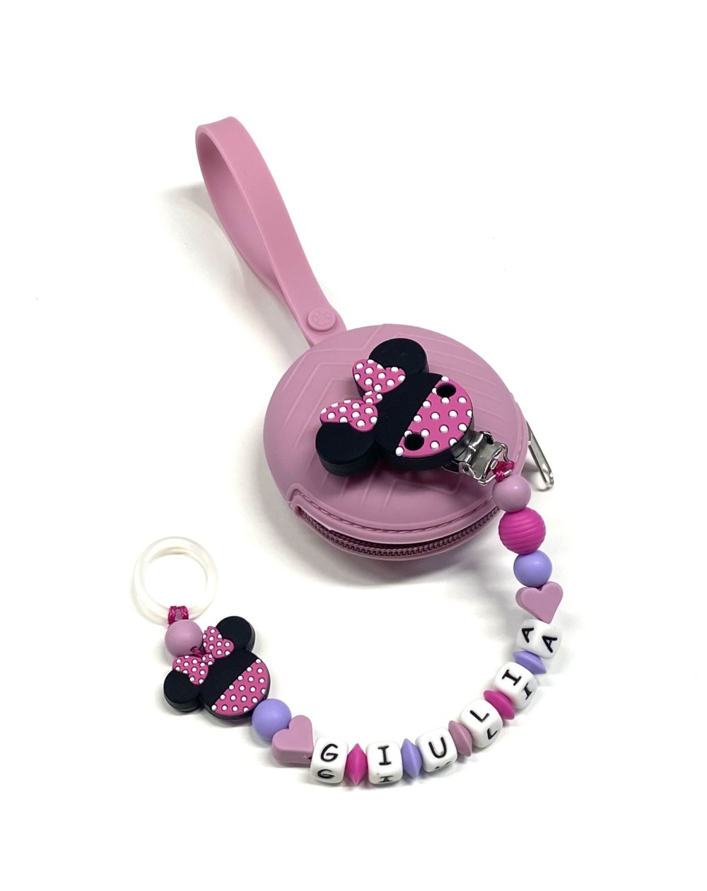 Babyjart Catenella portaciuccio PRESTIGE MINNIE BICOLOR in silicone con nome, gancio/adattatore ciuccio MAM e CHICCO