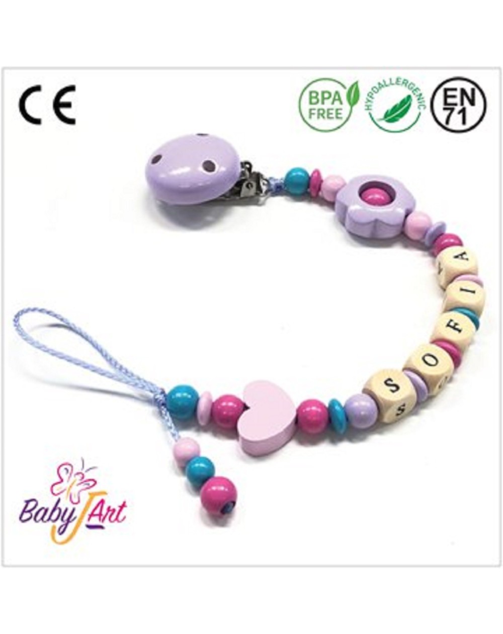 Babyjart Catenella portaciuccio legno con nome, gancio/adattatore ciuccio mam