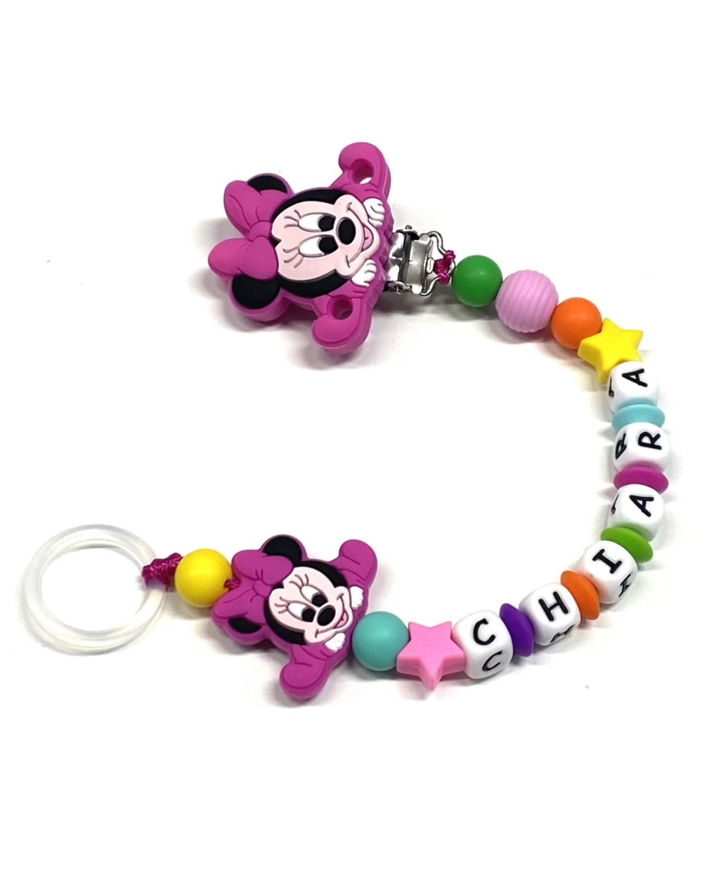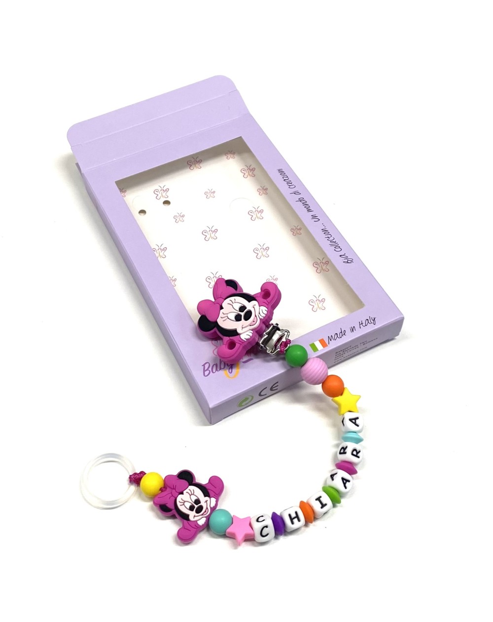 Babyjart Cadeia de chupeta PRESTIGE MINNIE de silicone com nome, adaptador / gancho de chupeta MAM e modelo CHICCO