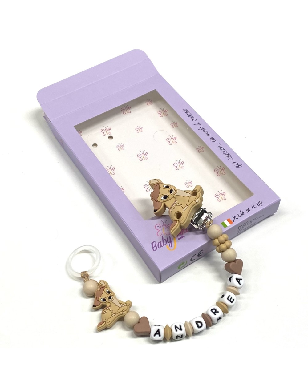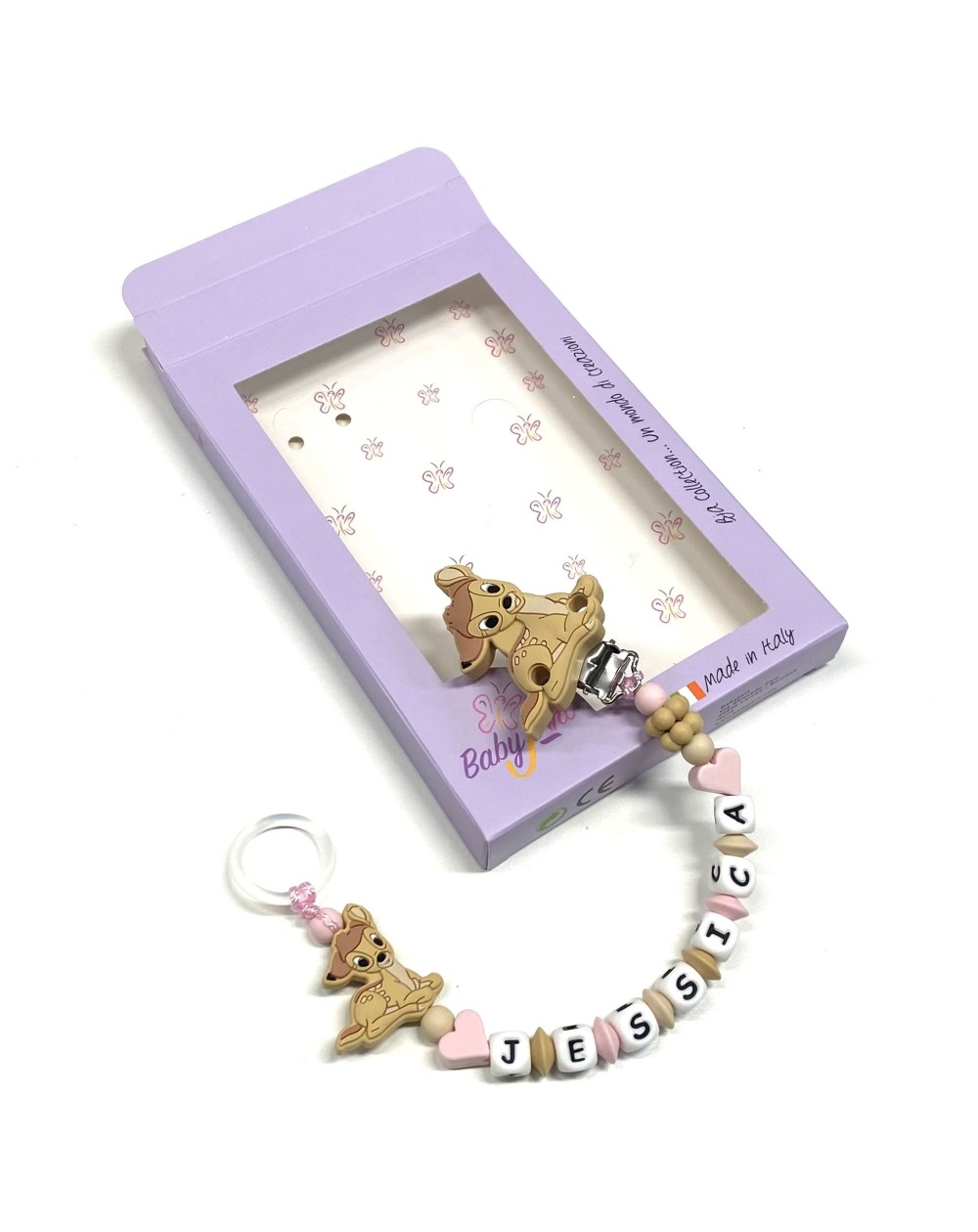 Babyjart Cadeia de chupeta PRESTIGE BAMBI de silicone com nome, adaptador/gancho de chupeta MAM e modelo CHICCO