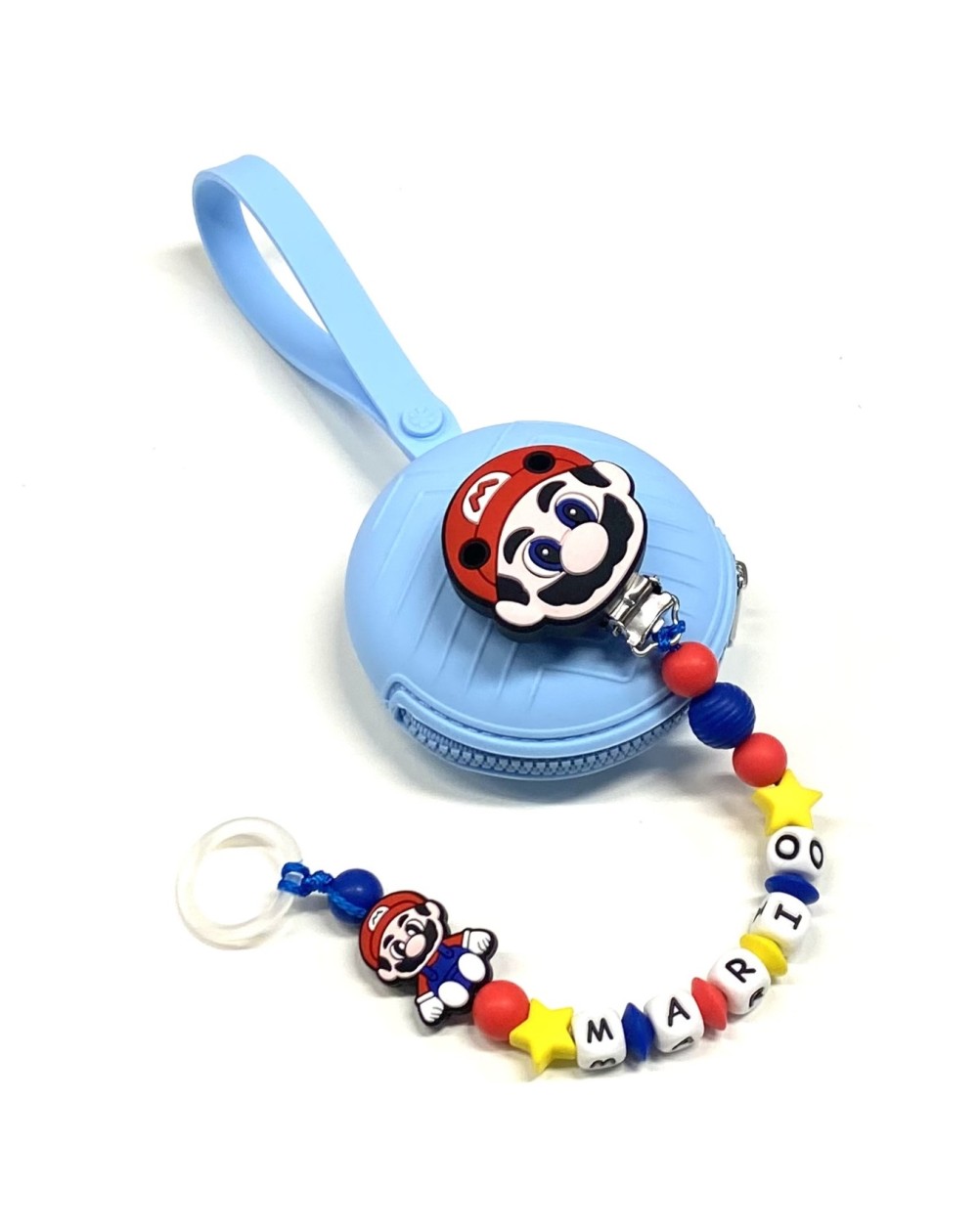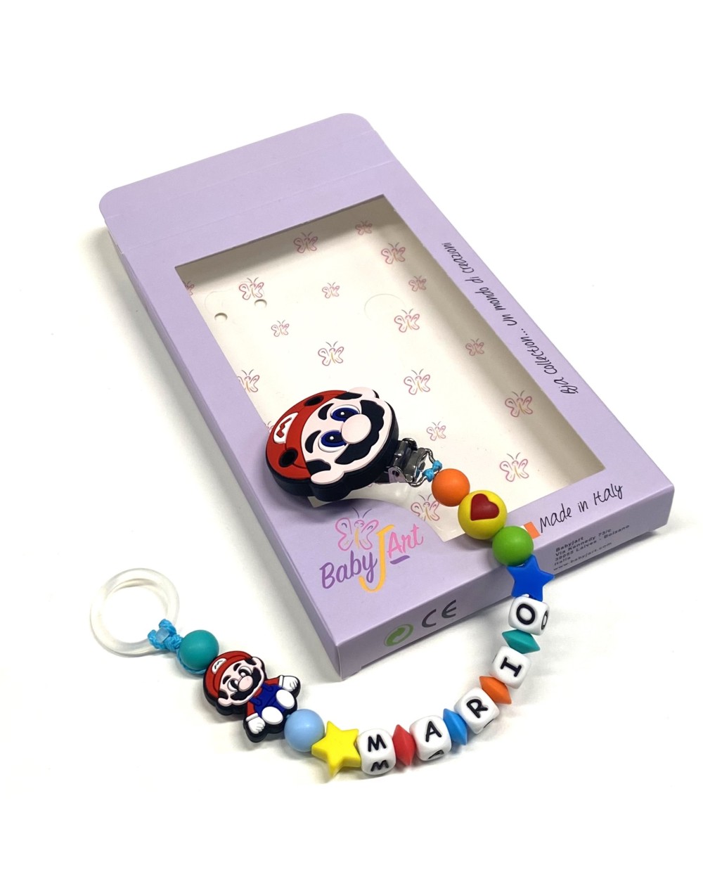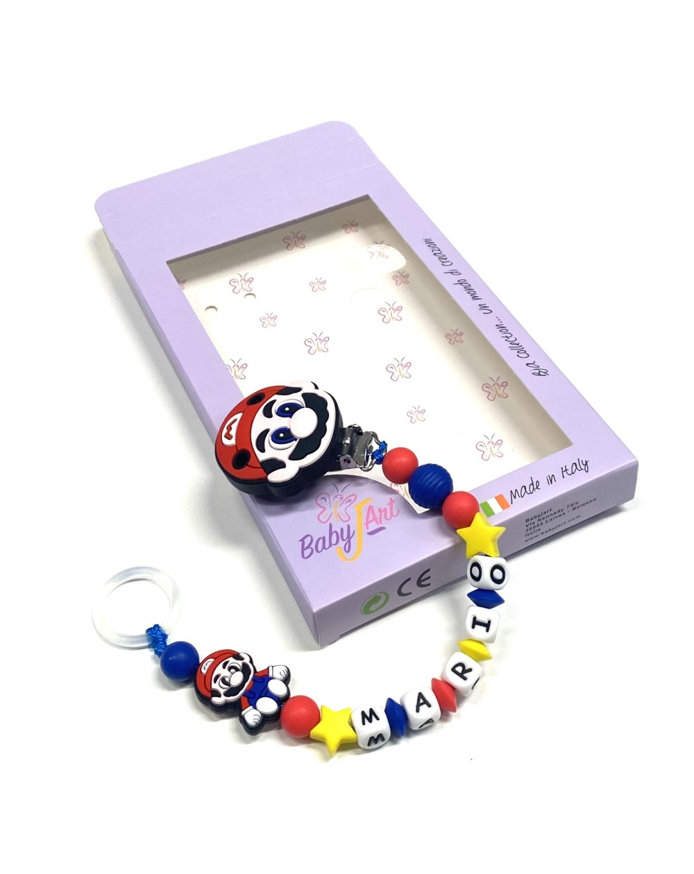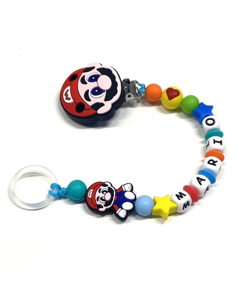 Babyjart Cadeia de chupeta PRESTIGE SUPER MARIO de silicone com nome, adaptador/gancho de chupeta MAM e modelo CHICCO