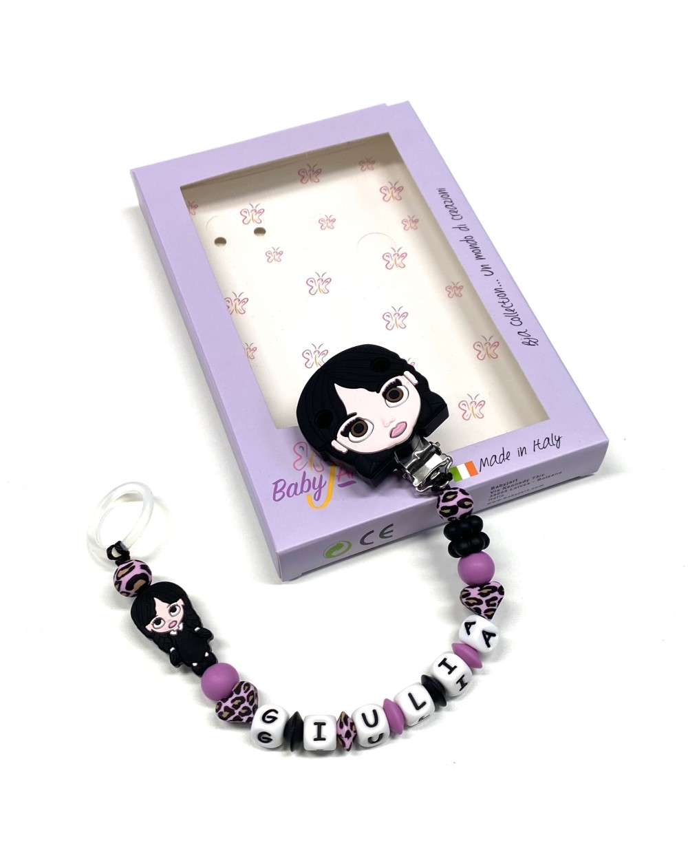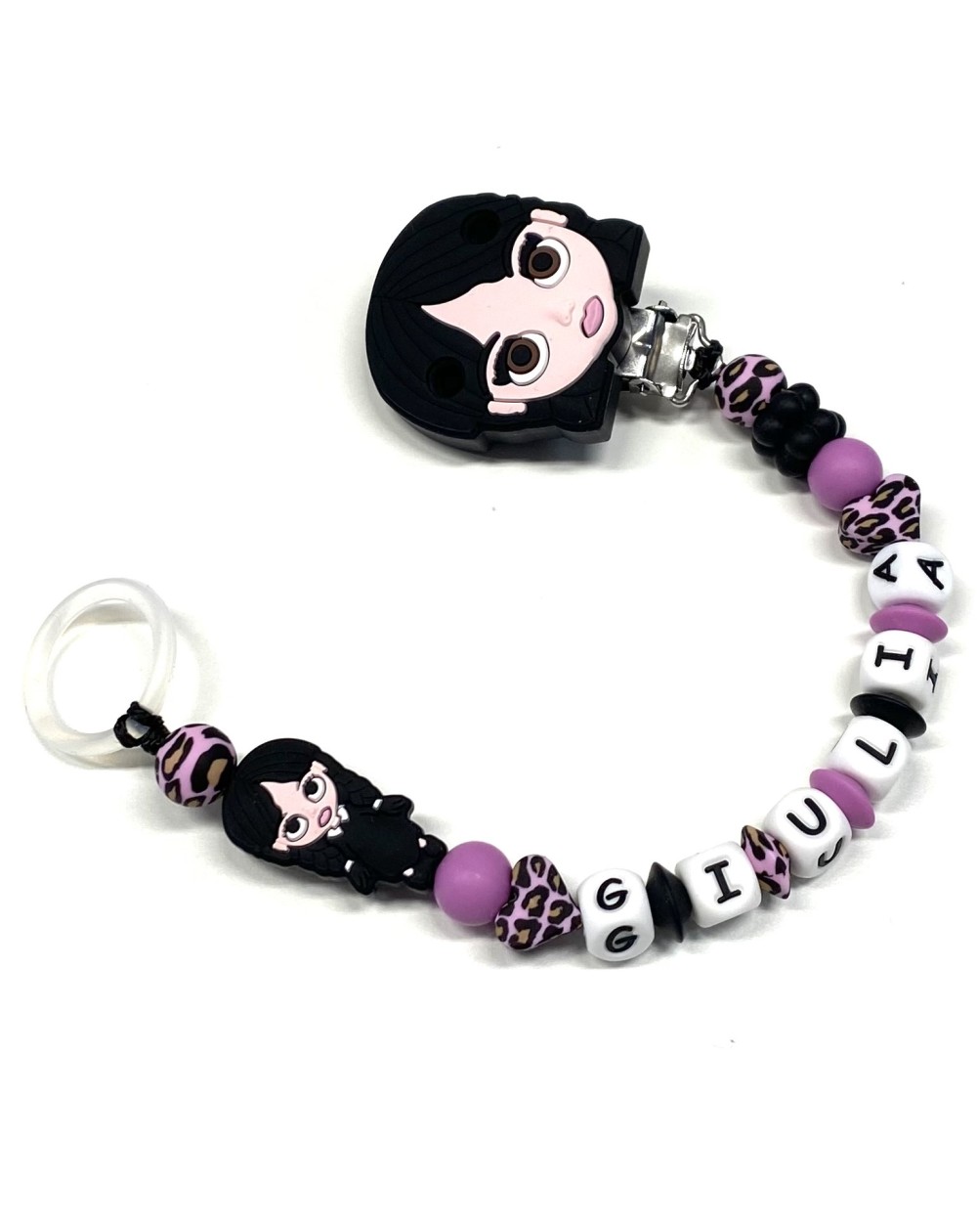 Babyjart Cadeia de chupeta PRESTIGE MIÉRCOLES ADDAMS de silicone com nome, adaptador de chupeta MAM e modelo CHICCO