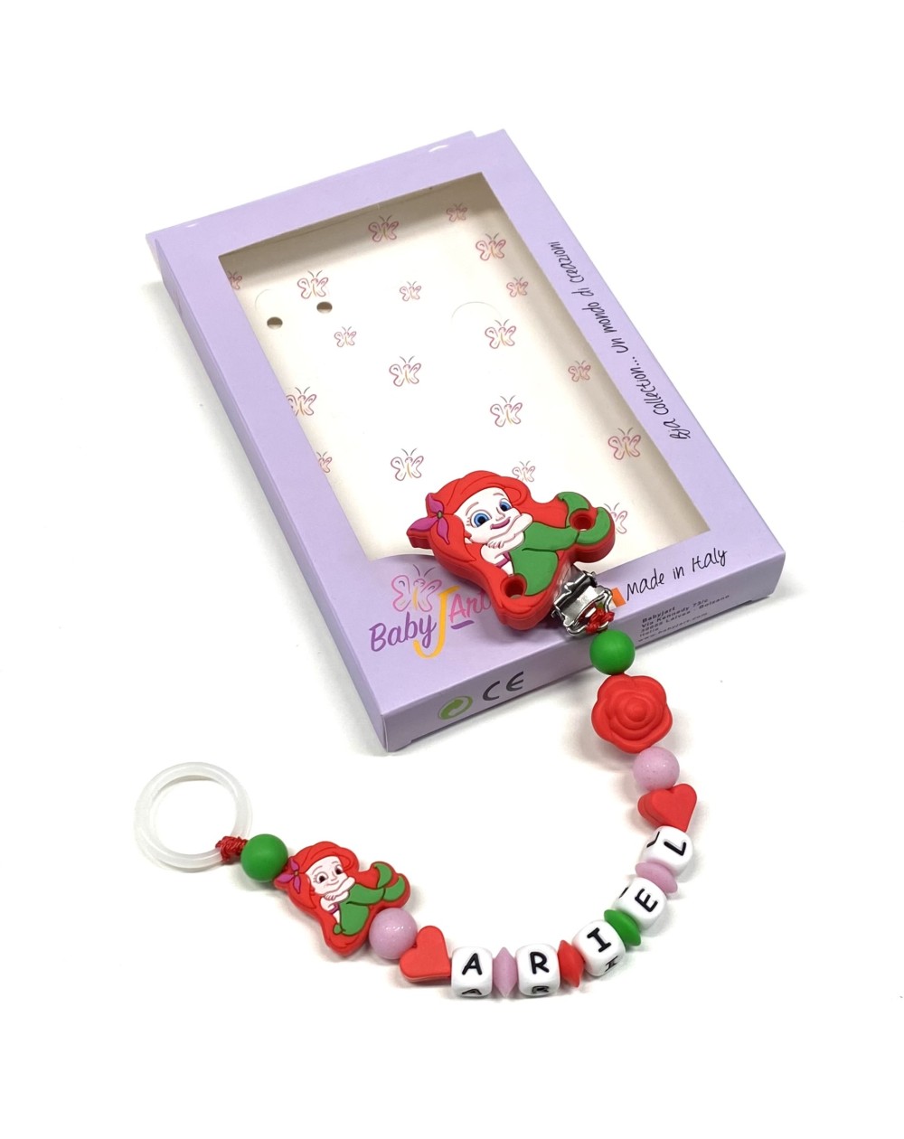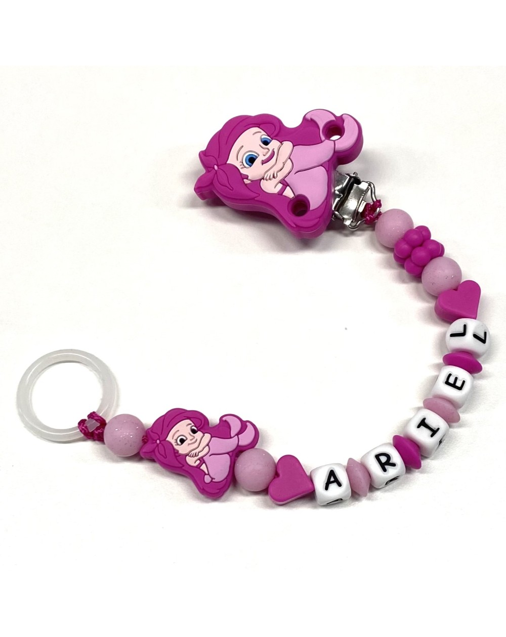 Babyjart Cadeia de chupeta PRESTIGE ARIEL A PEQUENA SEREIA de silicone com nome, adaptador de chupeta MAM e modelo CHICCO