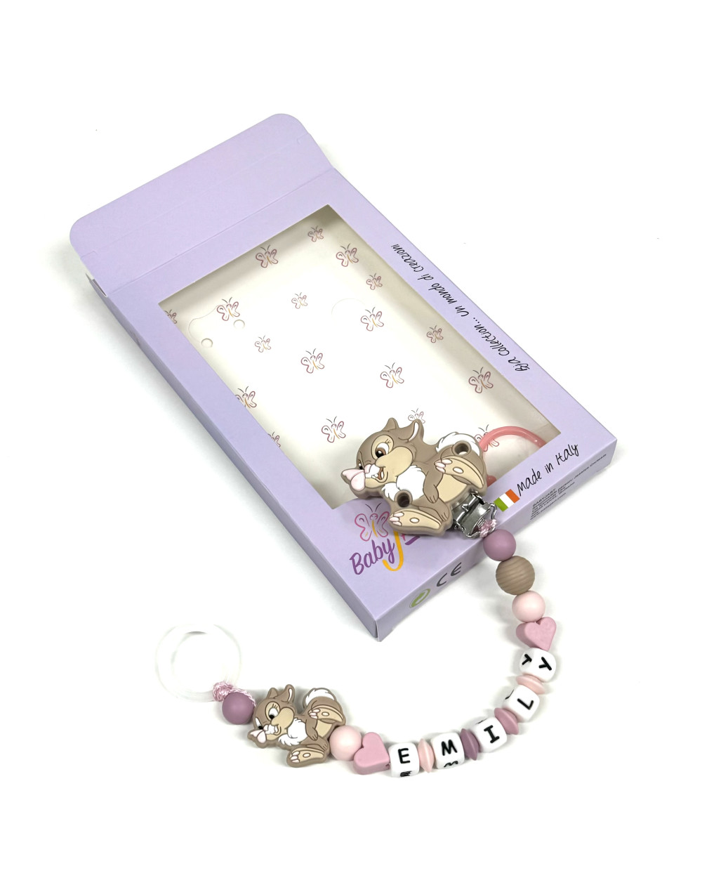 Babyjart Cadeia de chupeta MISS TAMBURINA de silicone com nome, adaptador de chupeta MAM e modelo CHICCO